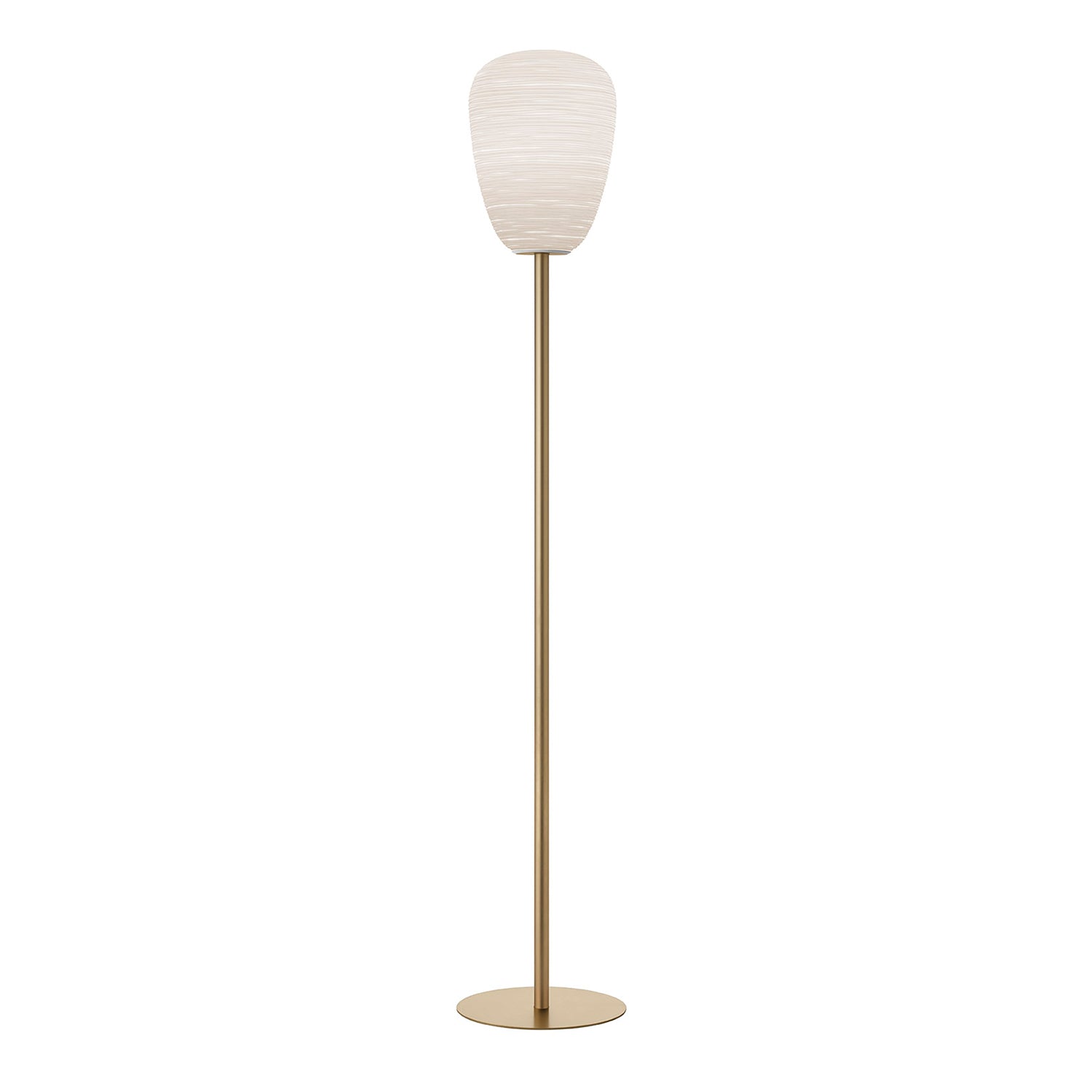 The Rituals 1 Floor Lamp designed by Ludovica and Roberto Palomba for Foscarini combines their classic lantern inspired diffuser with an updated base in gold-plated metal. This elegant floor lamp creates a feature in any modern living space. With a focused illumination, perfect for reading, either in the bedroom or living area. The engraved satin glass diffuser references the orient in the form of a lantern, whilst the streamlined base in gold completes the contemporary aesthetic. An integrated dimmer function allows customisation of light ambience. Handcrafted in Italy.