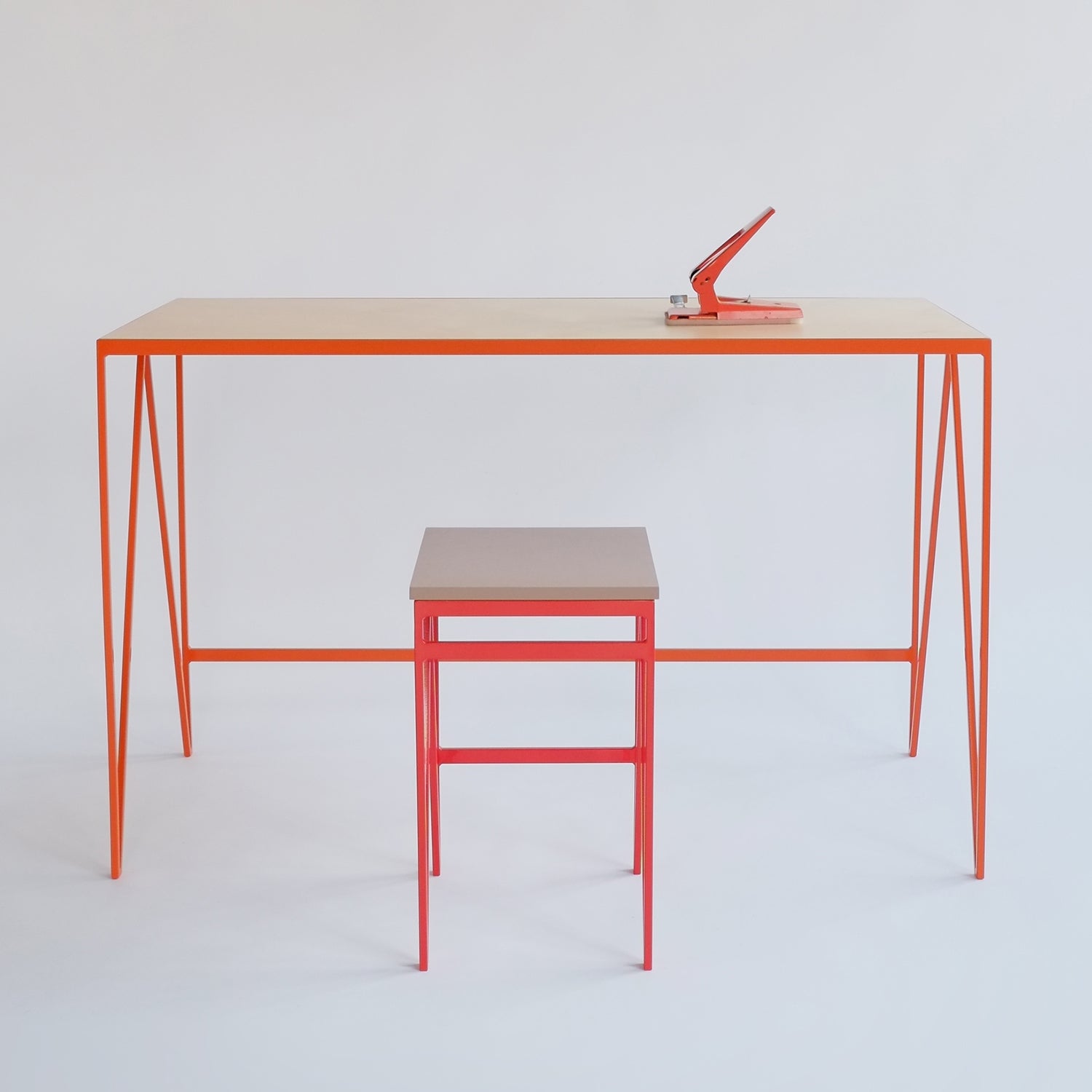 This compact and minimal Study Desk combines a streamlined steel frame powder-coated in vibrant orange, with a desk top in varnished birch plywood. The Study Desk features a geometric steel zig-zag base in lacquered steel. At just over one metre wide this versatile desk fits neatly into a smaller studio, home office or co-working space.