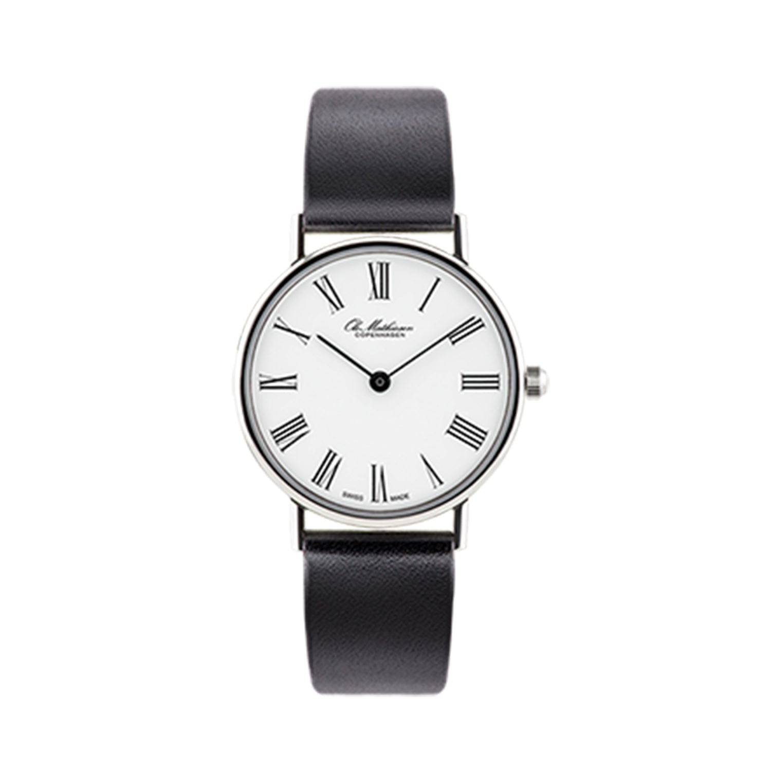 This discrete and prize-winning classic watch was designed by Ole Mathiesen in 1962. Expertly crafted from stainless steel with an ultra-thin Swiss quartz movement, the white dial features Roman numerals in black. The OM1.28.Q watch is finished with a scratch-proof convex sapphire crystal and black leather strap.