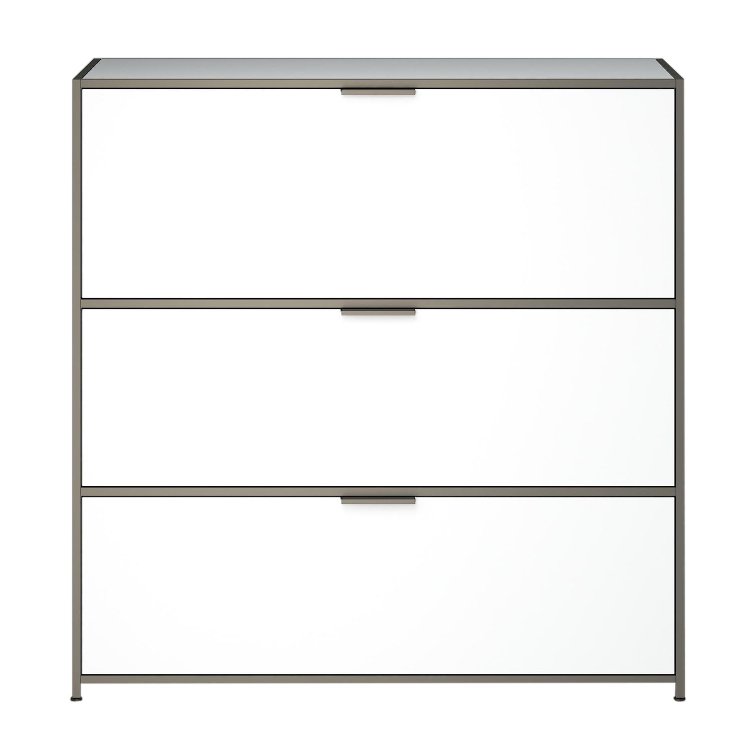 The discreet, upright anodised aluminium frame, with a brushed bronze finish, ensures maximum functionality with minimum floorspace. Its versatile size ensures the Dita Secretaire fits equally into a reception area, study or living space.