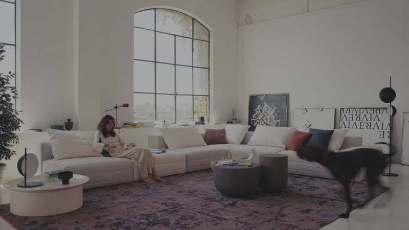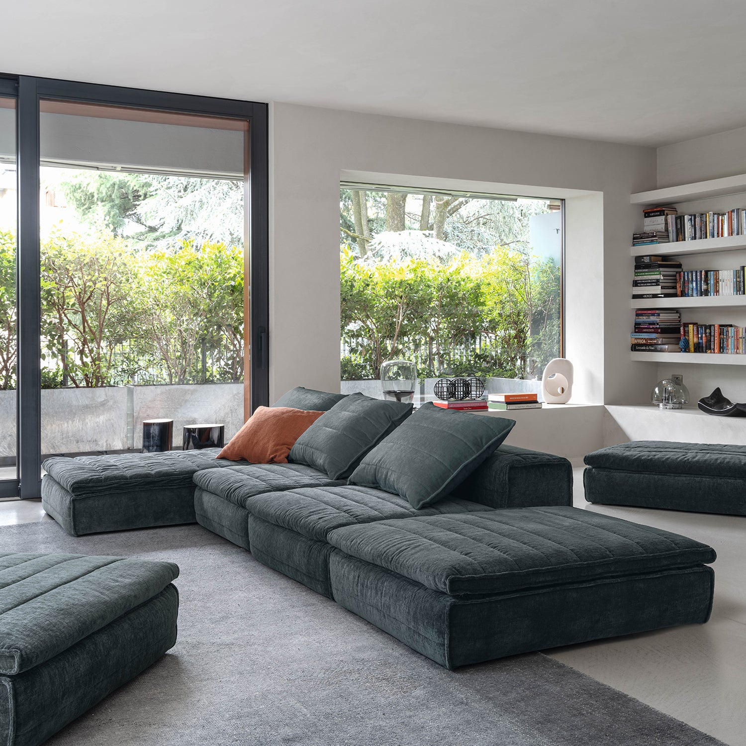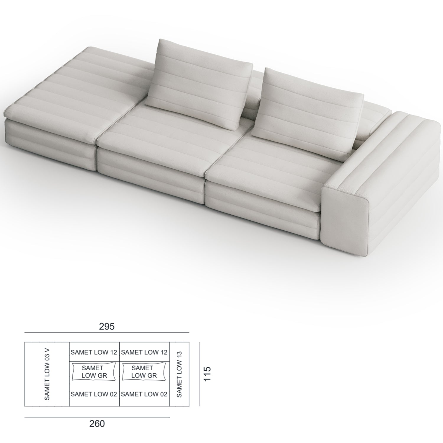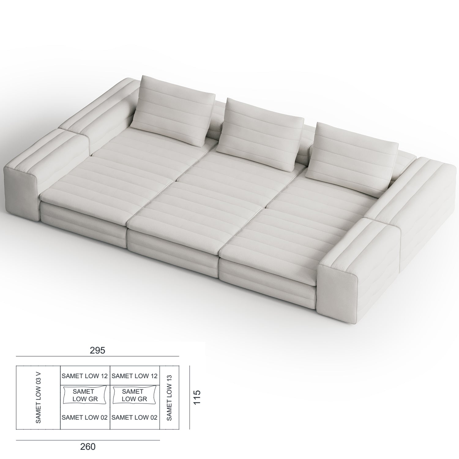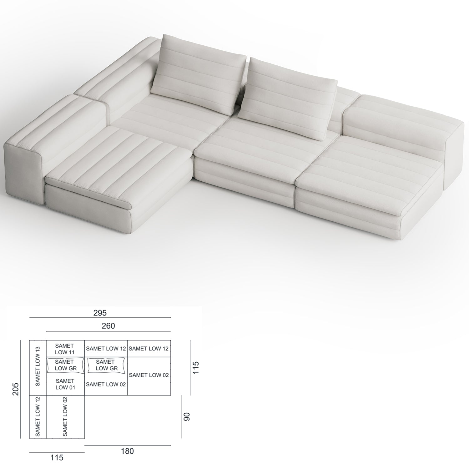This low version of the Samet Modular Sofa designed by Federica Biasi for Gervasoni combines the freedom of adaptability with the ultimate comfort. This contemporary sectional sofa boasts a low-level, super wide seat comprised of interconnecting modules. Samet can be configured exactly to meet the needs of your interior, with easily movable modules and can be scaled-up with additional sections as the household grows.
