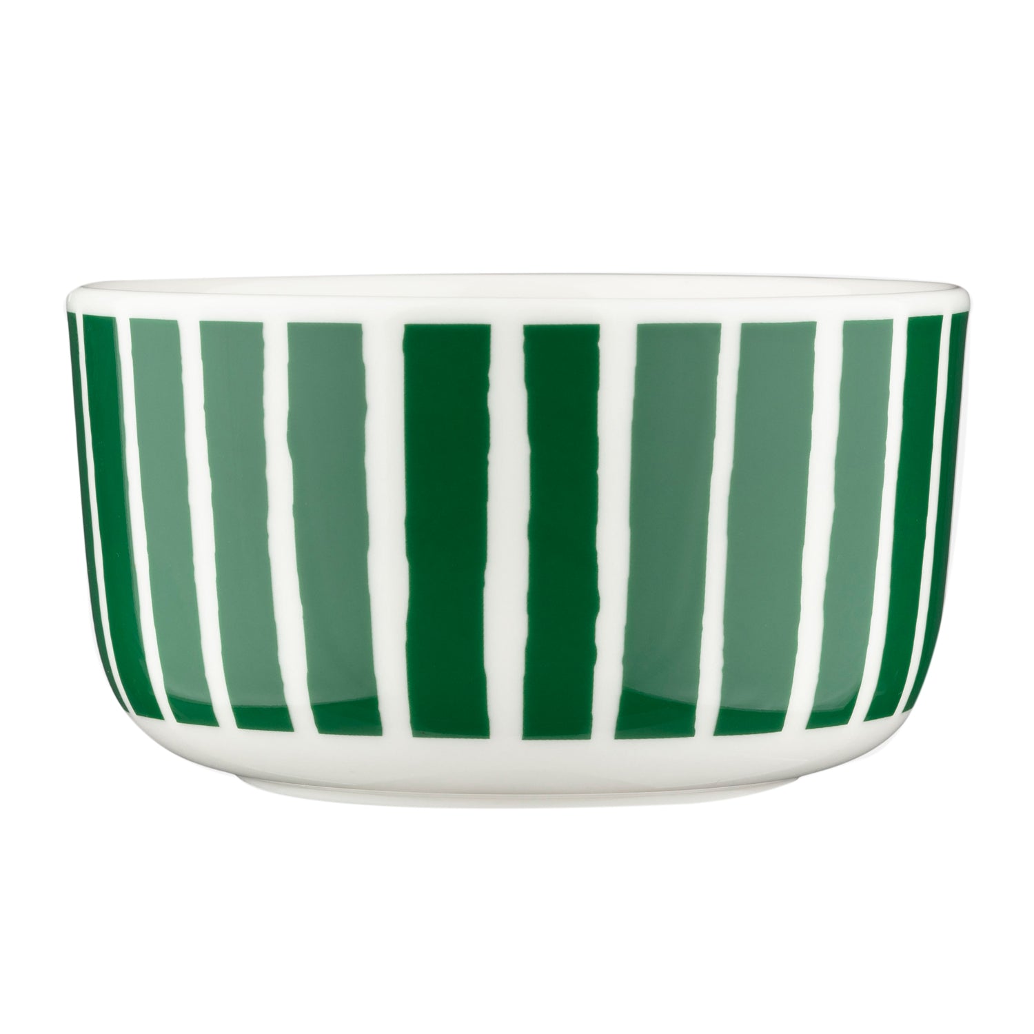 The Piccolo Bowl by Marimekko encapsulates Scandinavian design with its simple stripe pattern in green and white. The Piccolo print was designed in 1953 by Vuokko Eskolin-Nurmesniemi using vivid brushstrokes on fabric.
