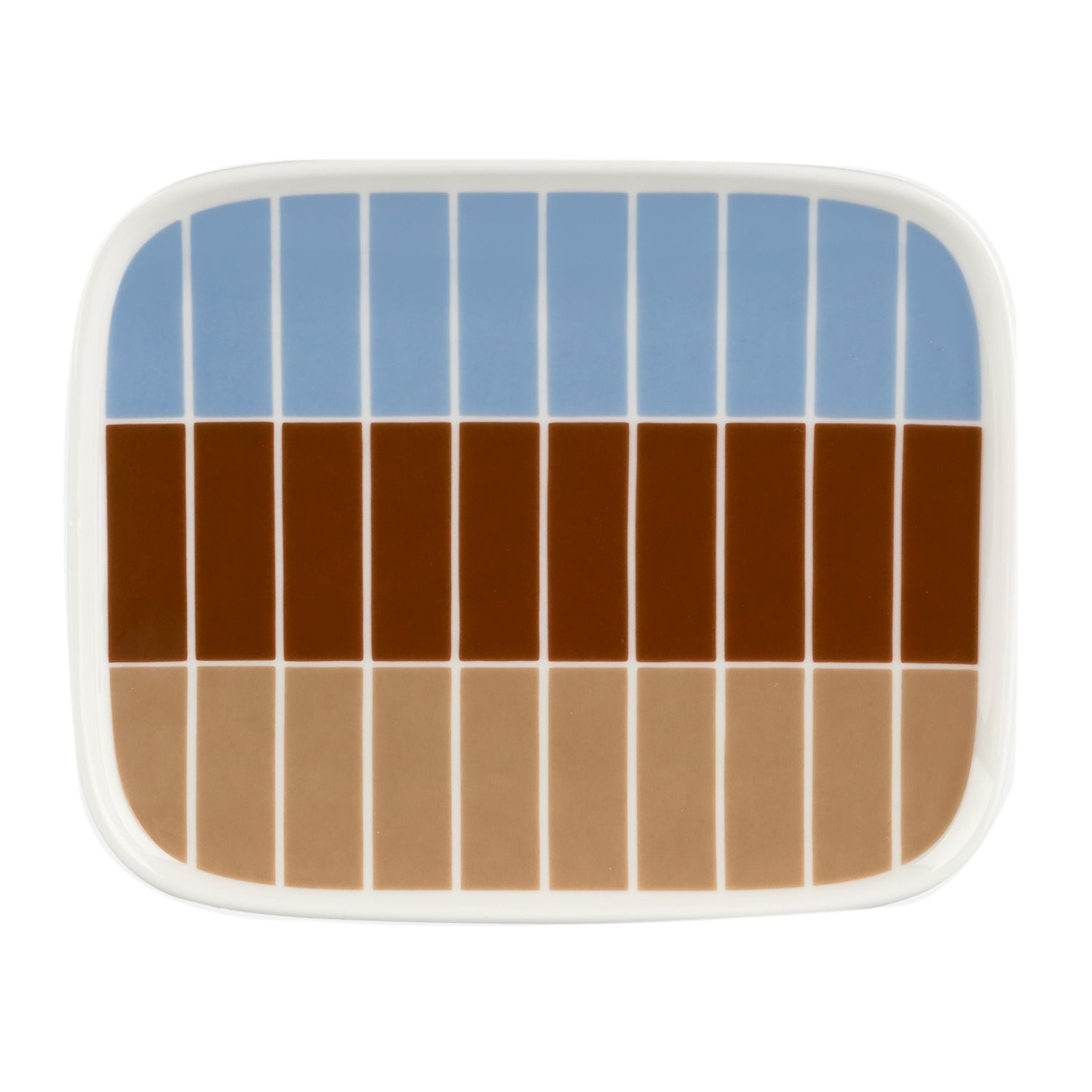 The rectangular Oiva side plate by Marimekko features a geometric grid pattern in blue, taupe and brown. The perfect size for snacks, desserts or appetizers this side plate combines perfectly with other pieces from the Marimekko collection.