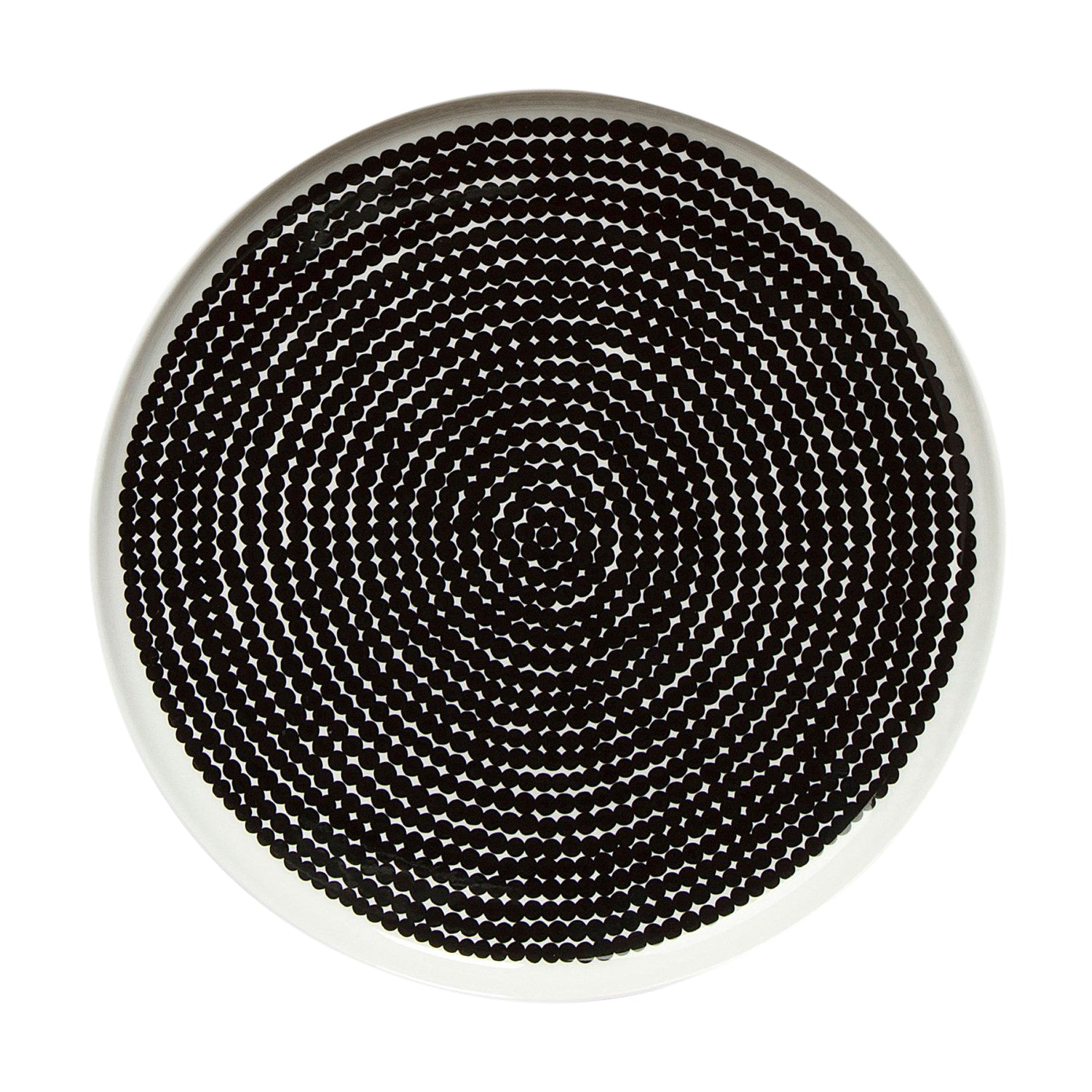 The Räsymatto Plate by Marimekko features a black bean pattern with an illustrative style in black on white stoneware. From Marimekko's classic collection, this monochrome plate easily combines with other pieces for a modern table setting. Dishwasher, microwave, and freezer safe. Glazed colours remain vibrant.