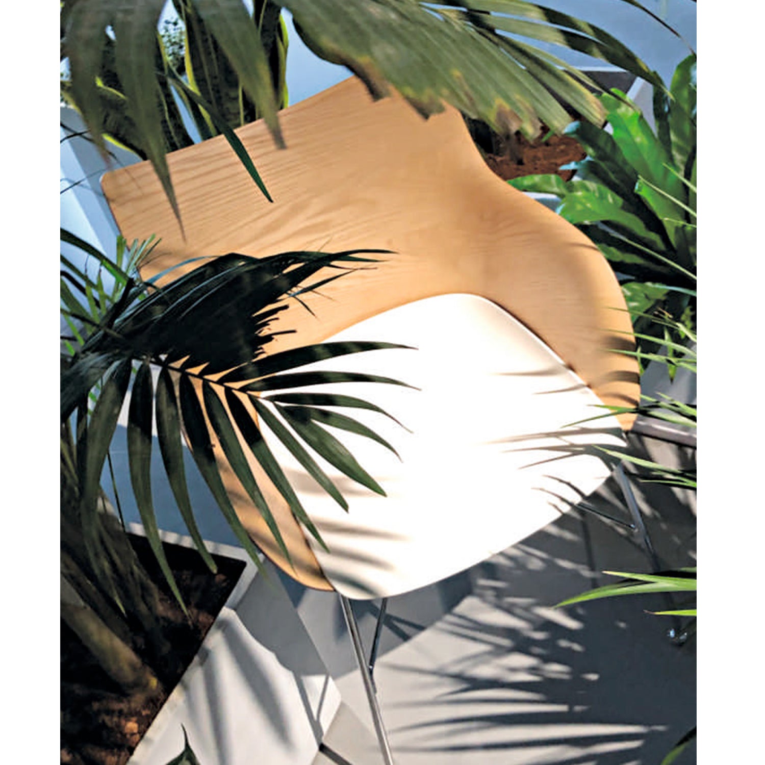 Materials: Shell crafted from curved 3d wood veneer, seat in mass-dyed thermoplastic techno-polymer. Base in chrome-plated or black-painted steel.