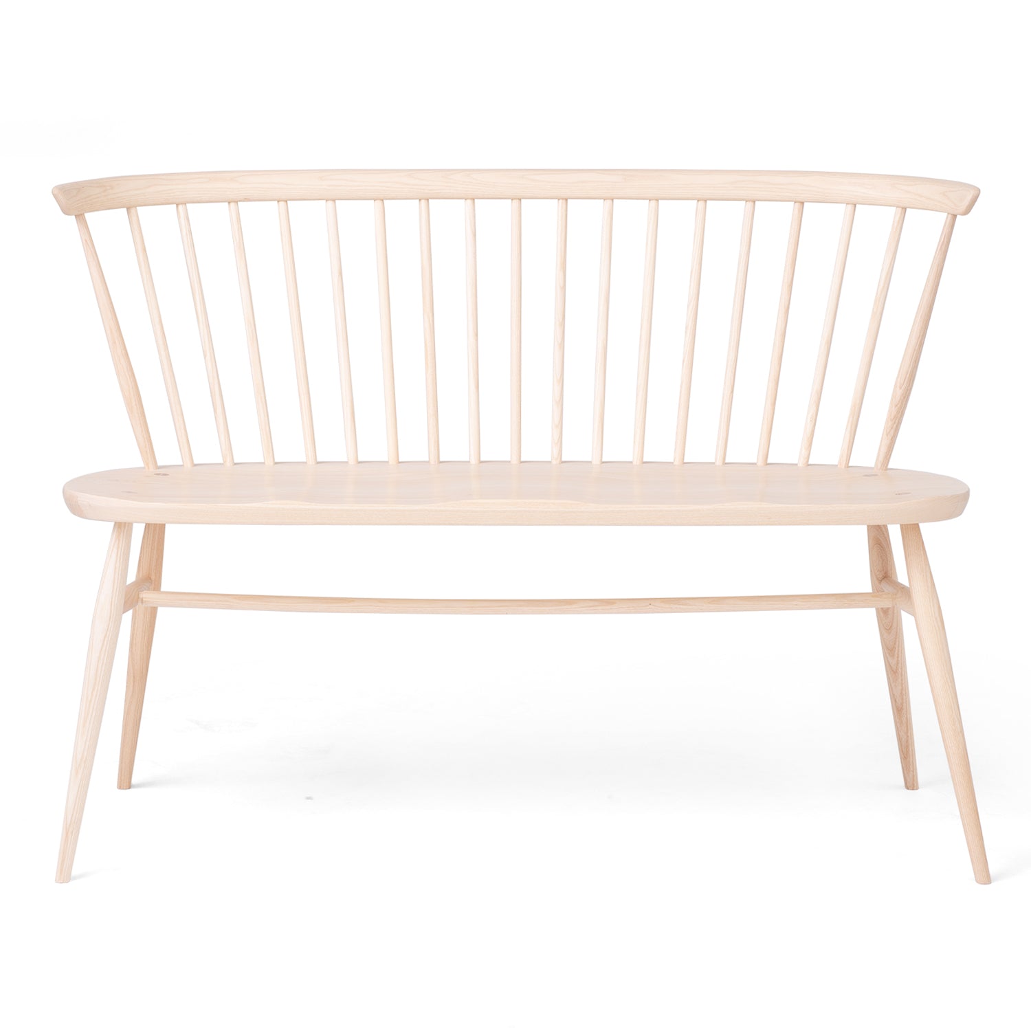 A progression of the iconic Windsor chair, the Love Seat designed by Ecol in 1956 features the unmistakeable silhouette, synonymous with the Mid-Century modern aesthetic. A steam-bent curved backrest, comprised of vertical spindles, is combined with tapered legs in solid ash or walnut. The outward shaped seat has ample space for two people and features a moulded base for optimum comfort.