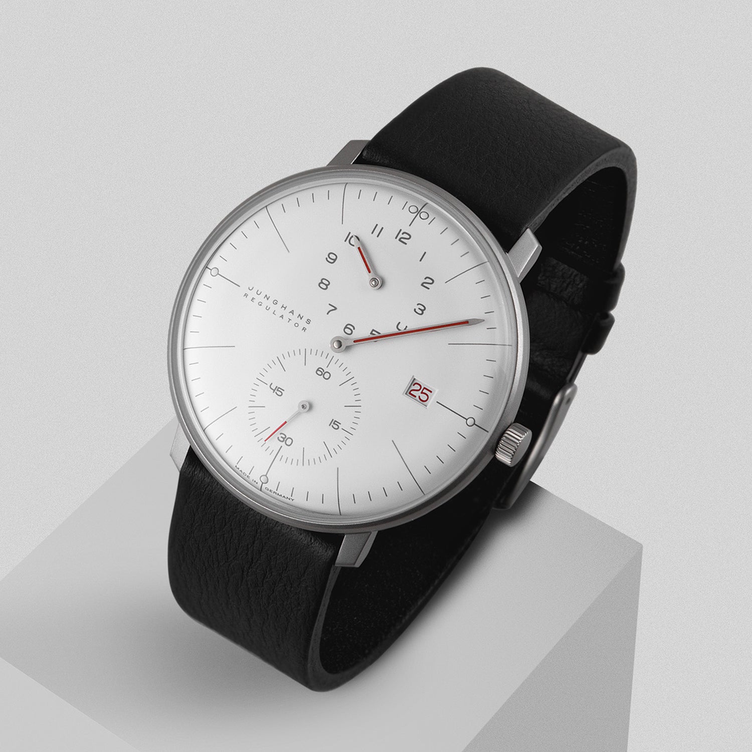 The Max Bill Regulator Bauhaus Watch 41/4493.02 by Junghans is clean and minimal in design. Caliber J800.5 and automatic winding with a power reserve of up to 38 hours, the Regulator even masters short-term measurement. Typified by the purist style of Bauhaus design, and more specifically the artistic hand of Max Bill, this luxury timepiece features a matte stainless-steel case, a white dial and colourful red accents on the hands and date.