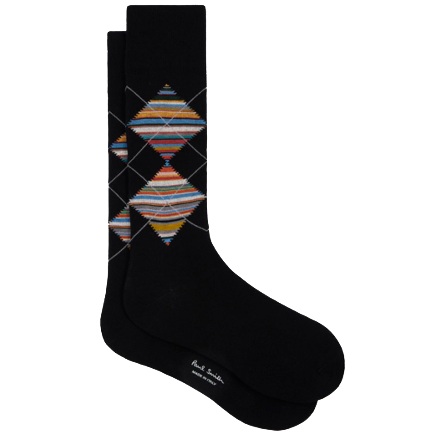 Classic Paul Smith socks featuring an Argyle pattern with the 'Signature Stripe' providing a flash of colour. Made in Italy with organic cotton.
