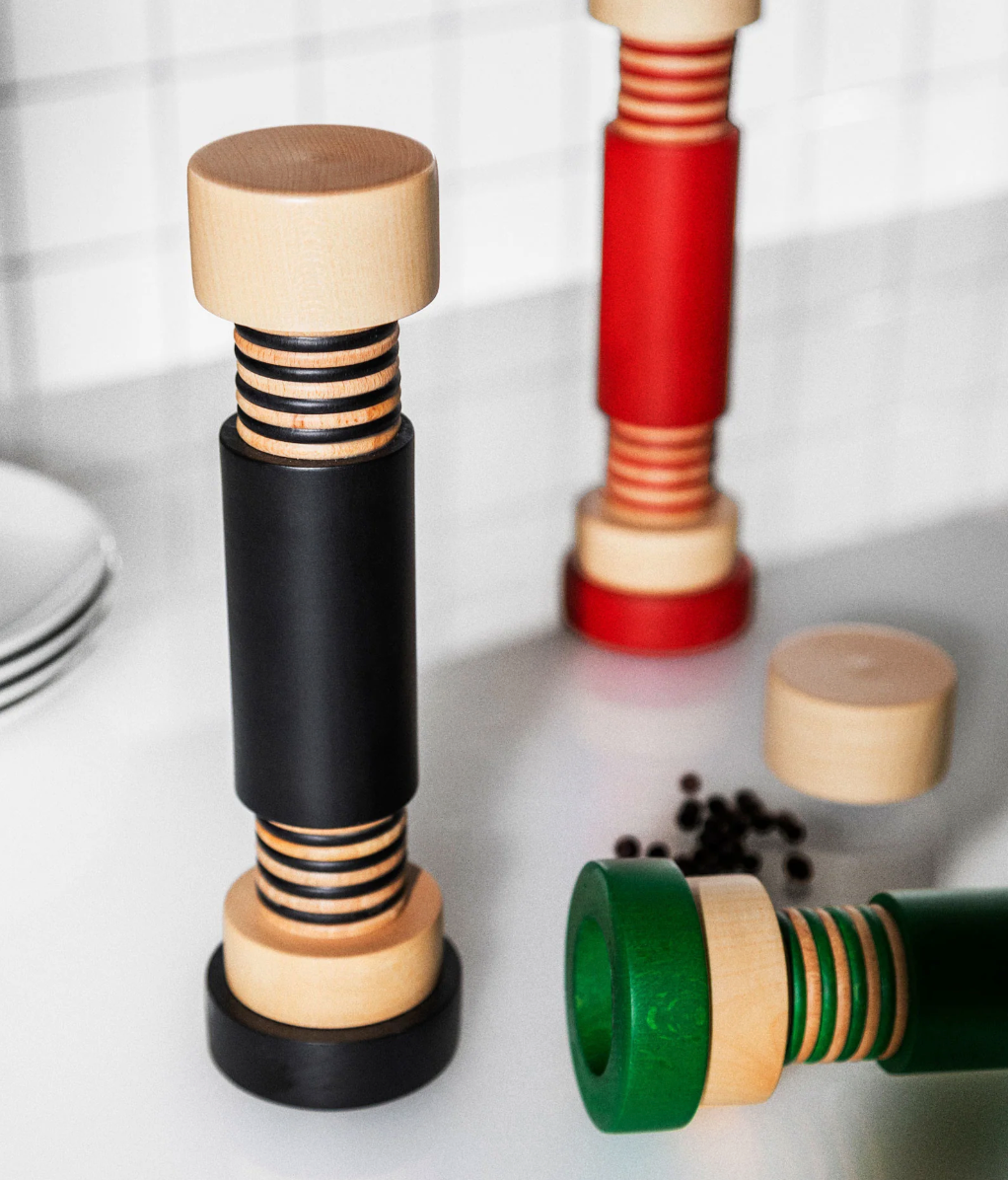 Designed by Ettore Sottsass for Alessi in 1989, this geometric pepper and spice mill is sure to make a statement in any kitchen. Its sculptural form is crafted from solid beech with a red, black or green finish.