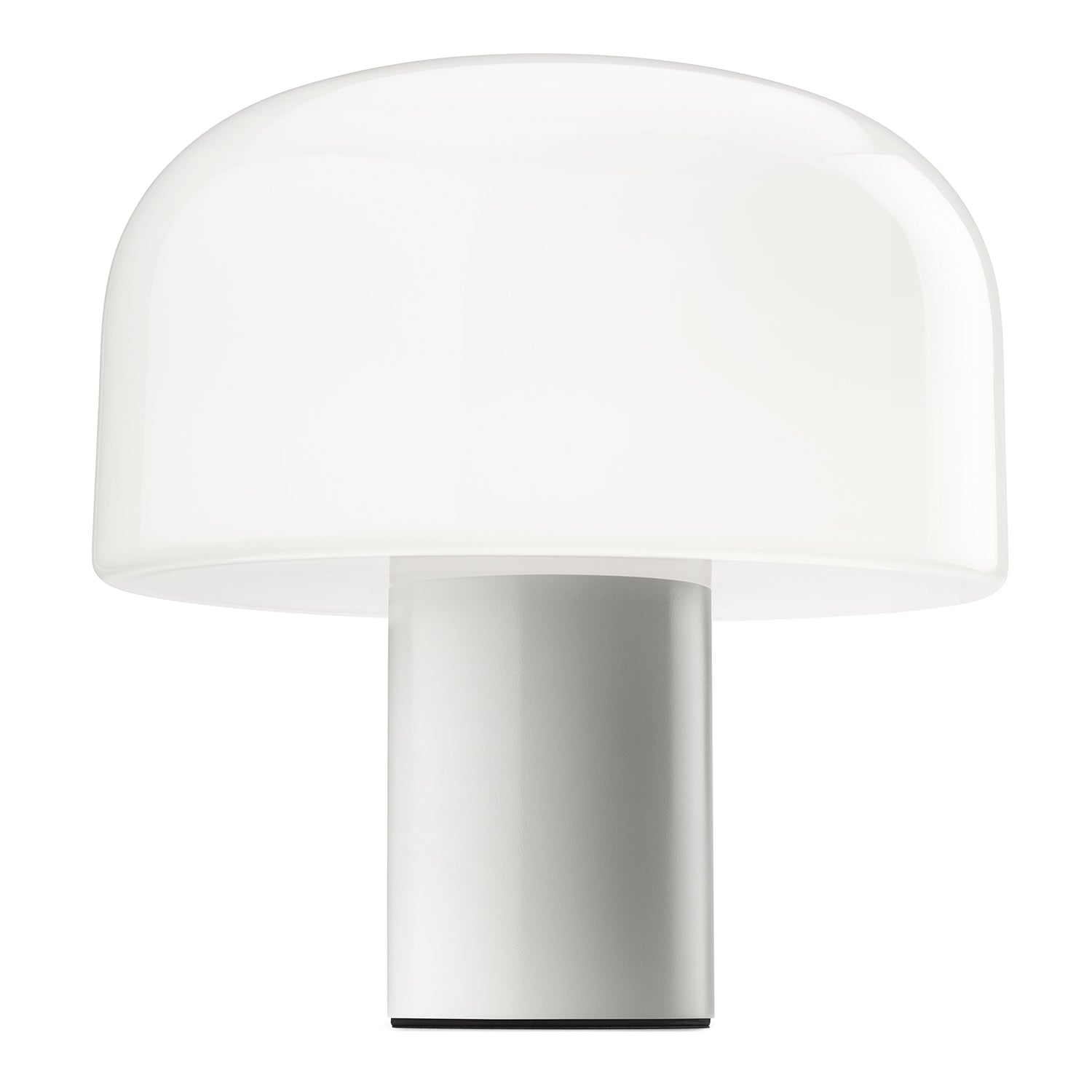 A new addition to the Bellhop collection, designed by Barber Osgerby for Flos, this super-sized table lamp emits an ambient and evenly diffused light via the dome-shaped diffuser. Alluding to the form of a mushroom, this retro table lamp is composed of a triplex opaline glass diffuser, sandwiching a central white layer within two layers of transparent glass, the three layers are hand-blown together creating a perfectly curved shape. The large diffuser emits a uniform and welcoming lighting, creating a warm atmosphere in the space. A statement light for any contemporary living space or bedroom. The cylindrical base is crafted from aluminium and available in three finishes, cioko, bright aluminium and white.