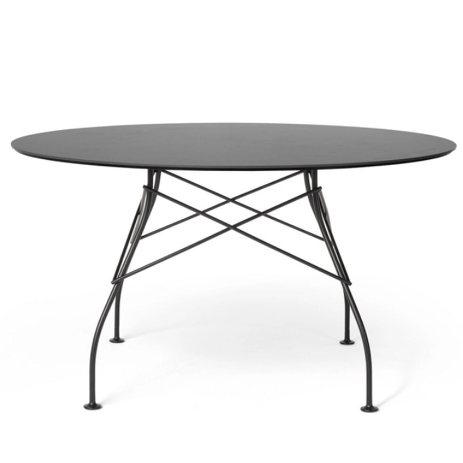 The Glossy Table, designed by Antonio Citterio for Kartell, marries a rounded table top in stoneware with a visually lightweight base in steel with a cross structure of streamlined metal legs. Explore the entire collection of square, oval and round versions made in a variety of materials. The robust nature of this round dining table makes it suitable for both indoor use and outdoor dining areas as a patio table.