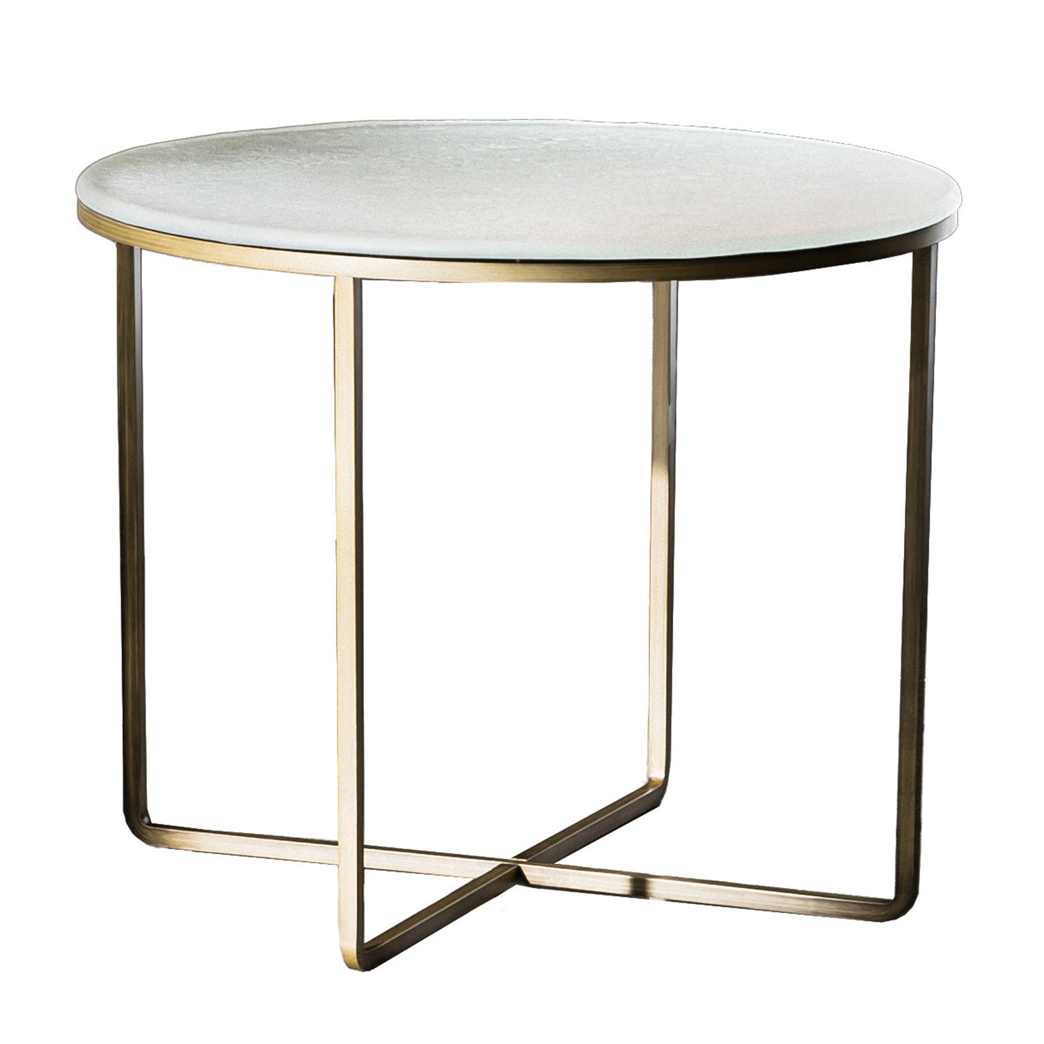 Materials: Table Top of Materia Glass in bronze or pearl, Base of lacquered metal with a burnished brass finish.