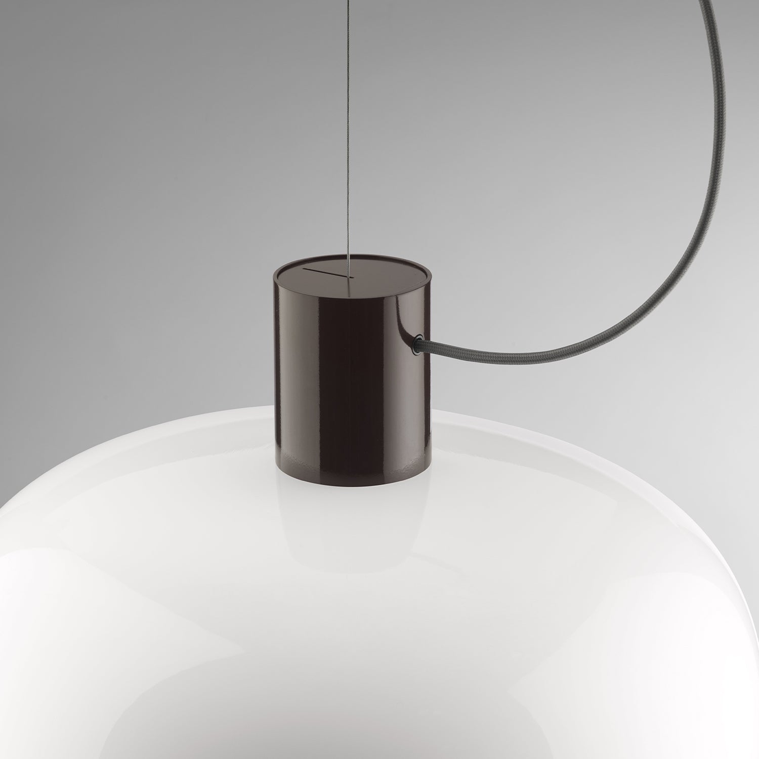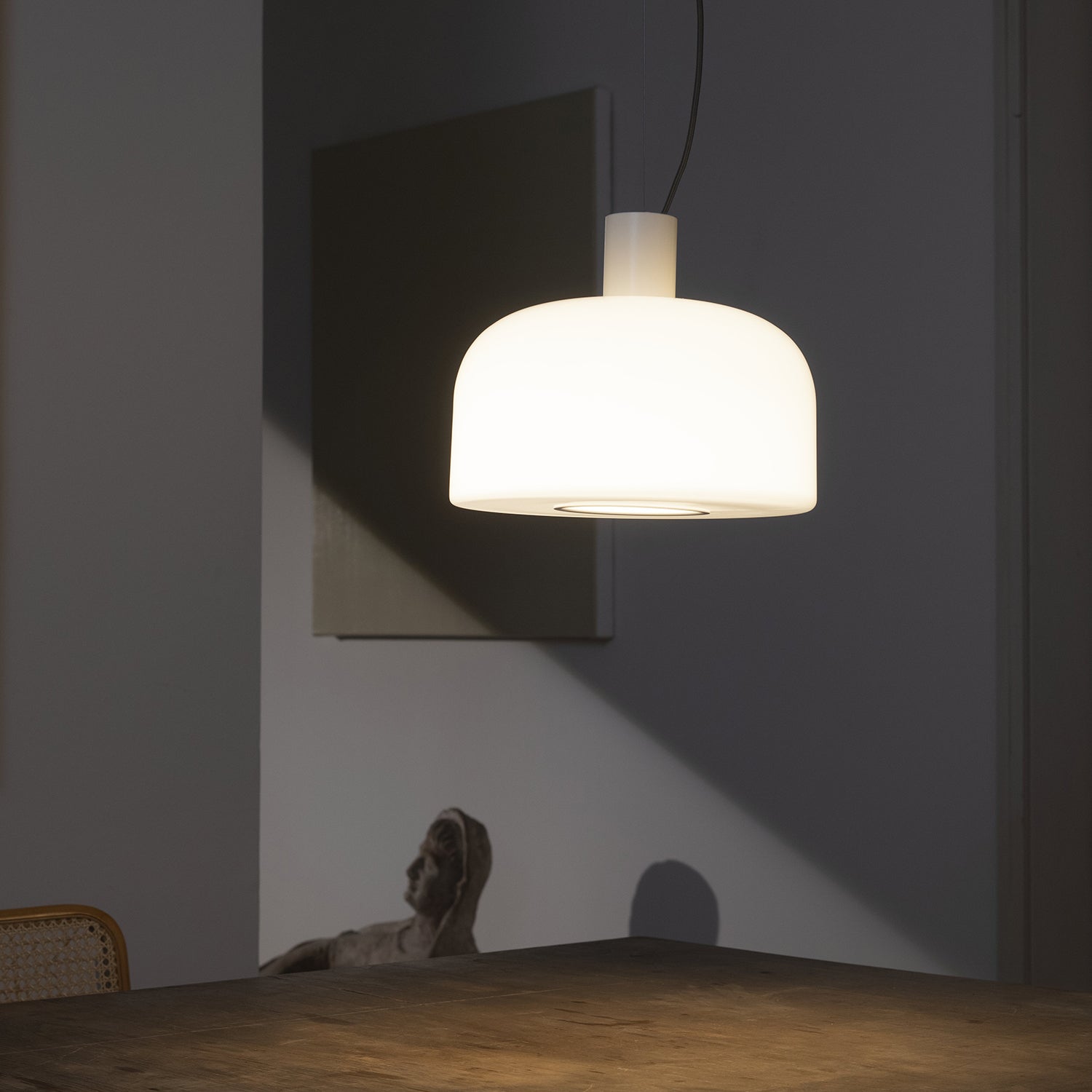 A new addition to the Bellhop collection, designed by Barber Osgerby for Flos, the new suspension light emits an ambient and evenly diffused light via the dome-shaped glass pendant. Alluding to the form of a mushroom, this retro pendant light is composed of a triplex opaline glass diffuser, sandwiching a central white layer within two layers of transparent glass, the three layers are hand-blown together creating a perfectly curved shape.