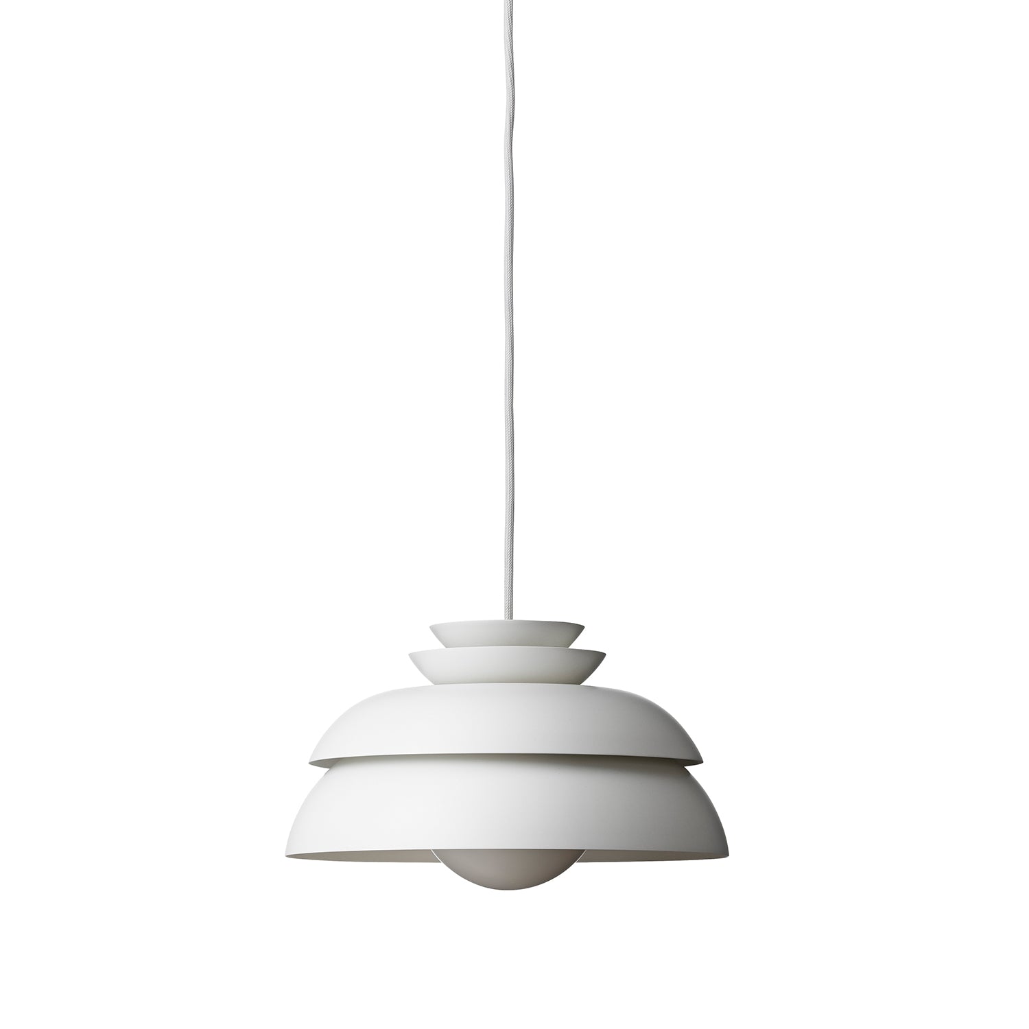 The Concert Pendant Light designed by Jorn Utzon for Fritz Hansen, references the clean lines of modernism with its layered silhouette, in a minimal white finish. This feature suspension light is comprised of four shades crafted from drawn steel, layered together in a series of symmetrical curves. Perfect for creating a focal point in any contemporary dining space.