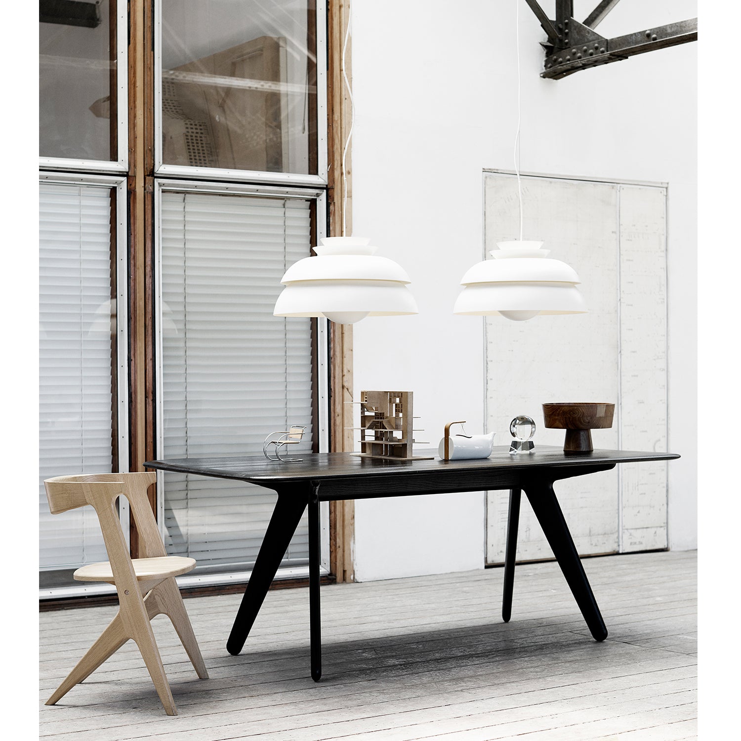 A central suspension, crafted from acid-etched glass emits an even light between the shades, avoiding glare without compromising on the strength of illumination. The lower shade casts light downwards to the parabola, which softens the light, regardless of the height installation of the pendant. With a sculptural form, the Concert Pendant Light alludes to the architecture of designer Jorn Utzon’s Sydney Opera House.