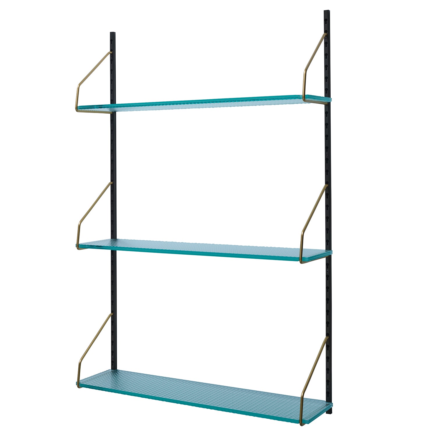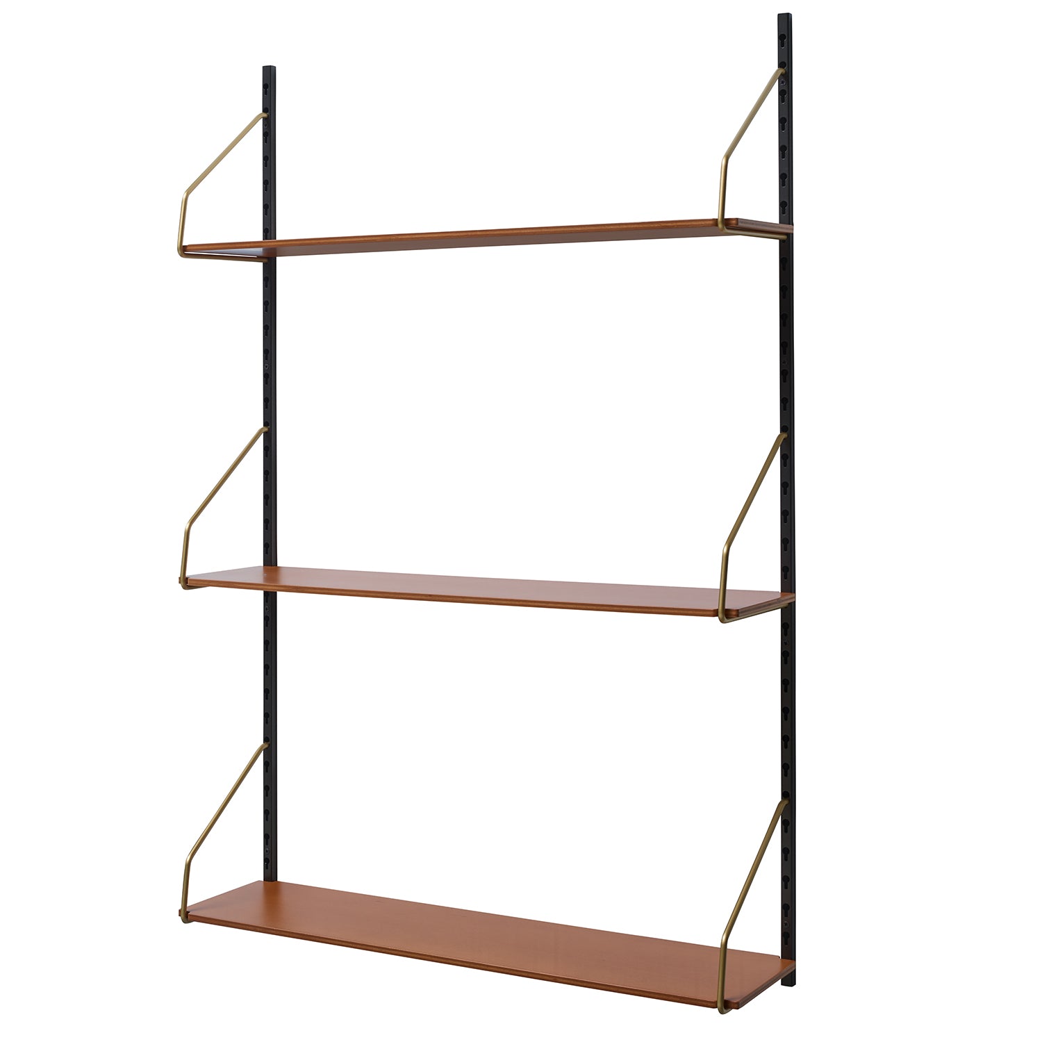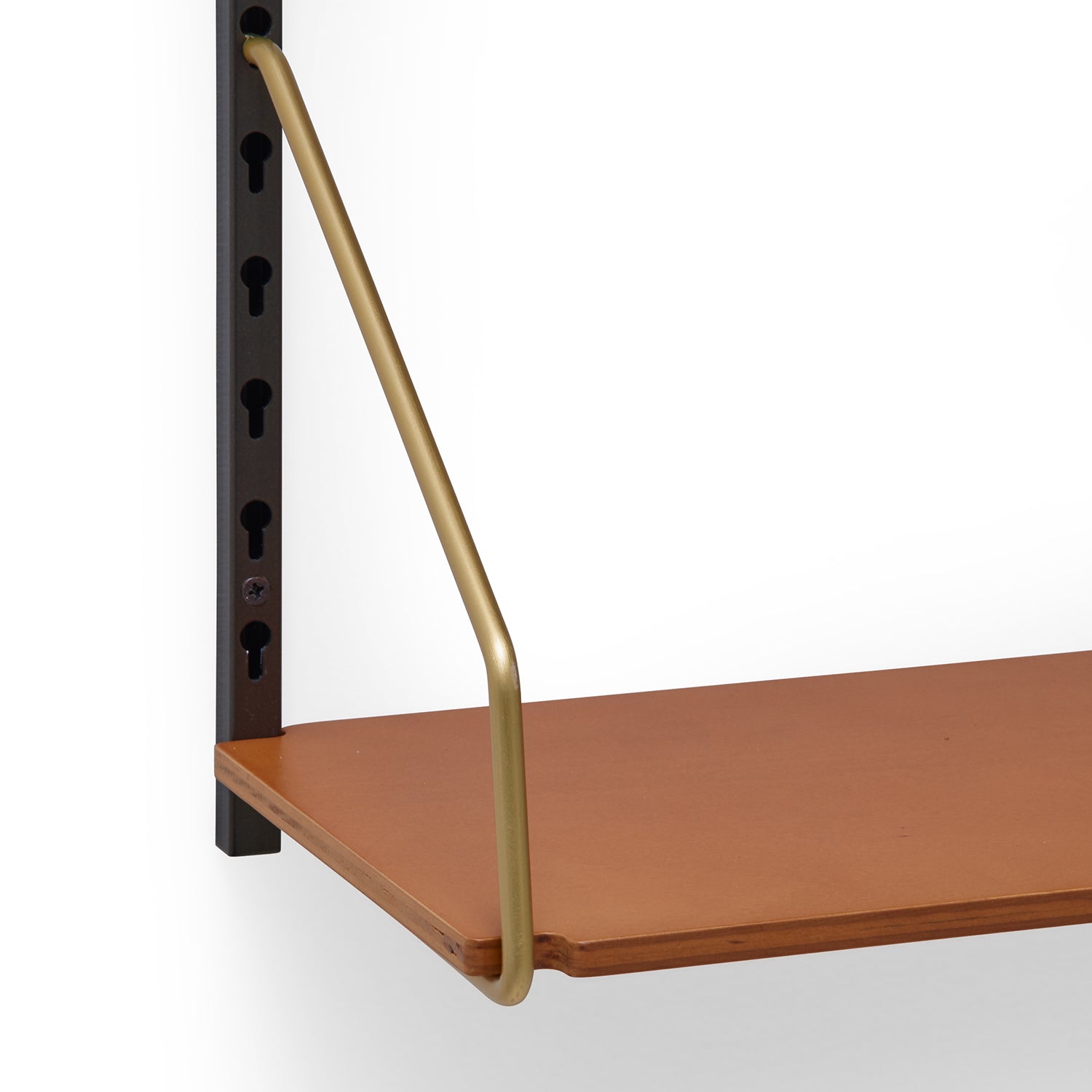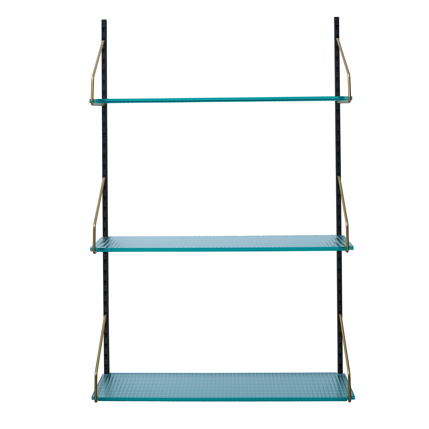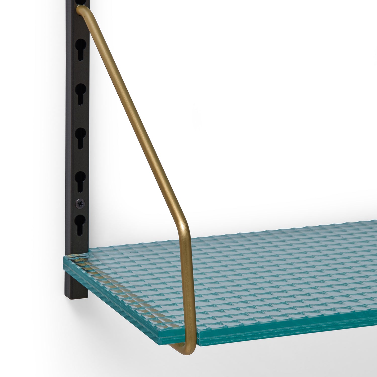 Materials: shelf supports in brass lacquered steel. Shelves in clear, embossed, laminated glass or stained beech veneered plywood. The shelves are removable.