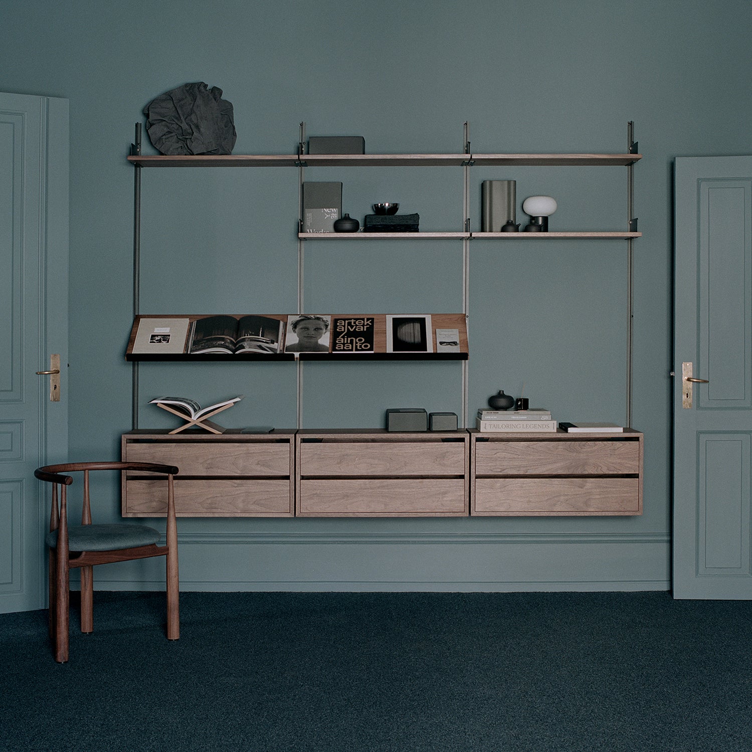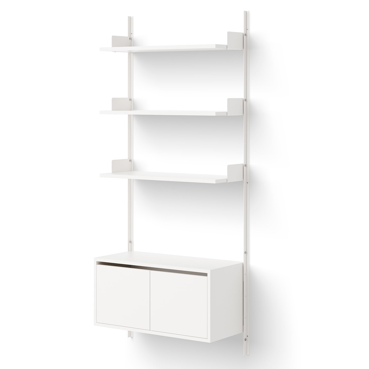 Designed by Knut Bendik Humlevik for New Works, this wall-mounted shelving and storage unit combines contemporary aesthetics with practicality. Its streamlined form articulates the art of subtle storage solutions, seamlessly integrating with the wall and freeing up floor space. The elegant vertical supports are crafted from powder-coated steel, whilst the shelves and cabinet in walnut or oak veneer give a natural touch to this modern storage unit. The shelves feature ample space to display your favourite books and most treasured objects, whilst the two-door low cabinet effortlessly hides away the essentials.