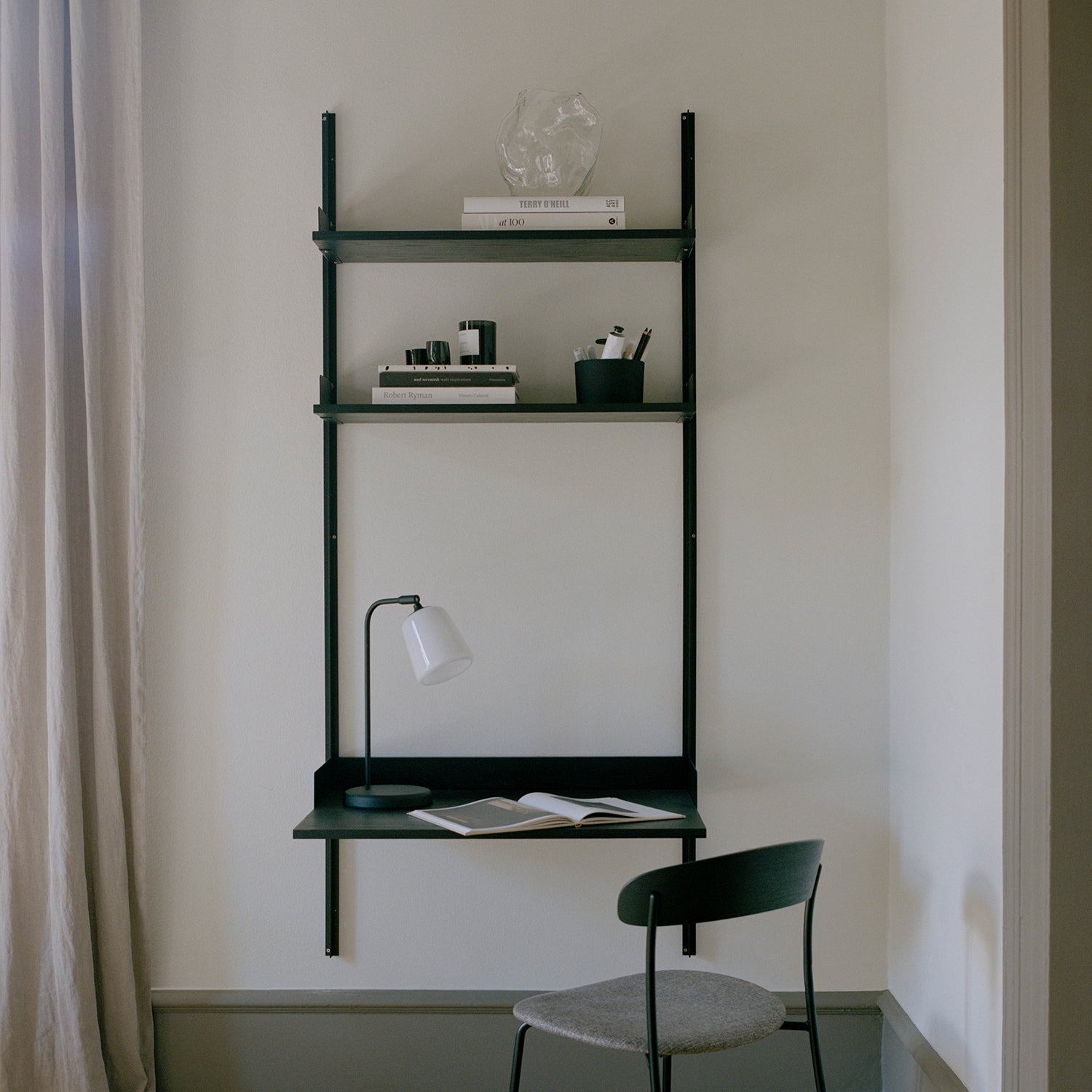 Designed by Knut Bendik Humlevik for New Works, this wall-mounted shelving features a built in desk space. Perfect for hybrid living spaces this streamlined unit seamlessly fits into any office corner or living space. The elegant vertical supports are crafted from powder-coated steel, whilst the shelves and desktop in walnut or oak veneer give a natural touch to this modern storage unit. The shelves feature ample space to display your favourite books and most treasured objects, whilst the table top features an outlet for cables, which holds them neatly in place.