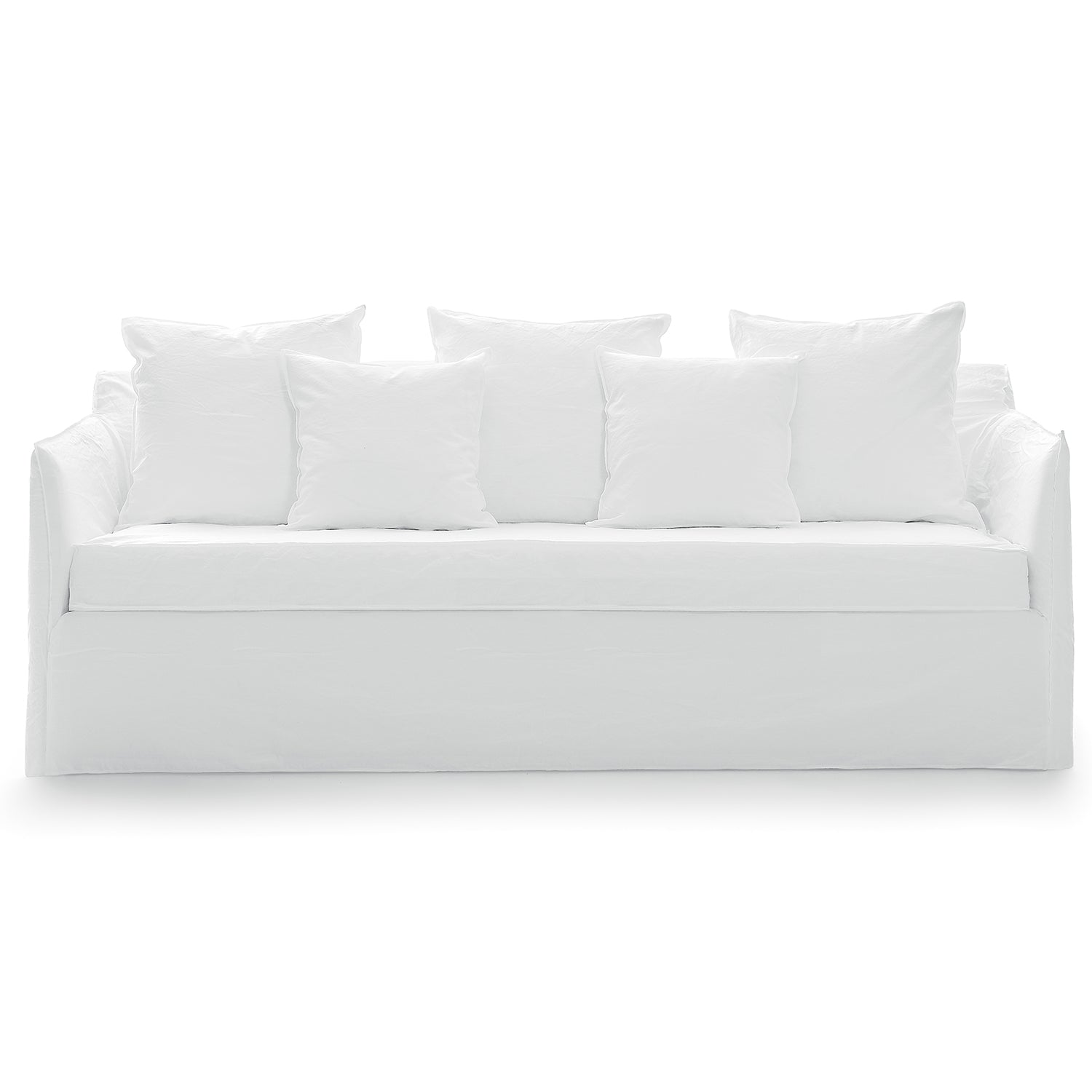 The Ghost Double Sofa Bed 19, designed by Paola Navone for Gervasoni, combines a visually lightweight form with ample proportions. Offering the ultimate comfort, this luxurious two-seater sofa transforms into a double bed. Its contemporary frame is finished with high armrests, whilst the rectangular form of the base is accentuated with the floor-length fabric upholstery. With an integrated double mattress this sofa bed is perfect for modern living spaces or spare bedrooms, offering additional sleeping space for extra guests. The removable cover in natural white linen features visible stitching detail on the seams.