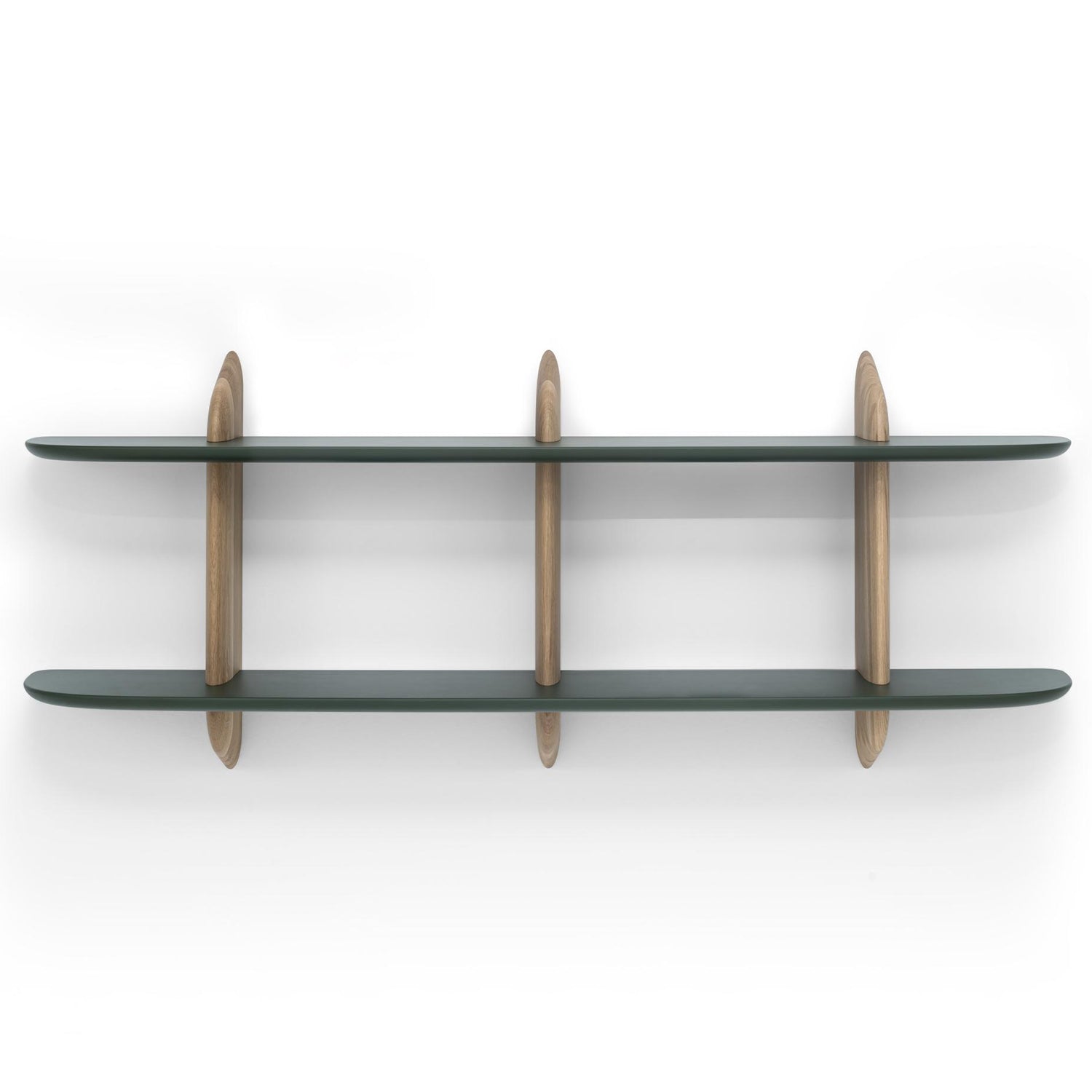 Materials: Solid American walnut with natural varnish and satin black lacquered shelf or varnished whitened solid oak and satin green lacquered shelf.