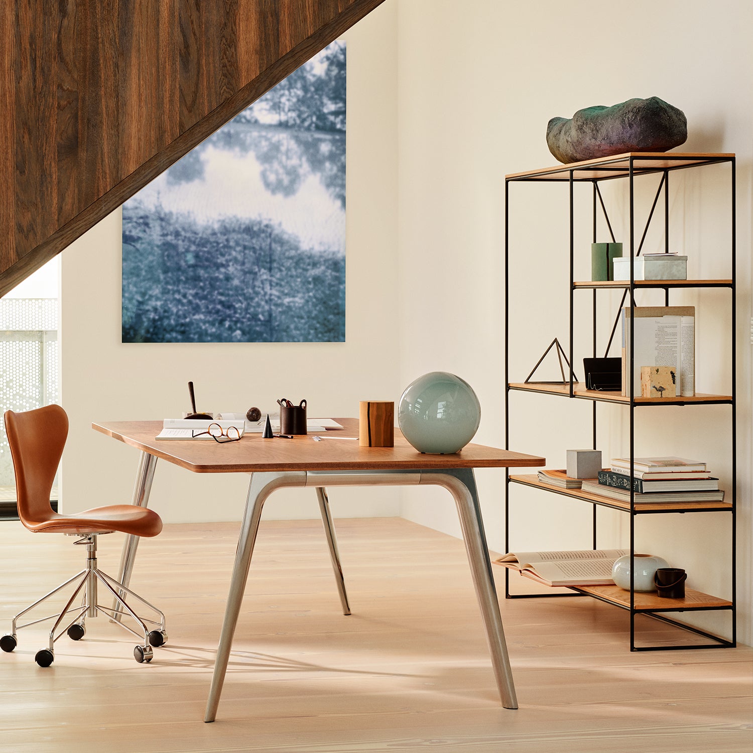 Each joint is hand-welded and gently rounded, whilst the natural oak veneer shelves are finished with bevelled edges. Available in three different versions with varying heights and configurations.