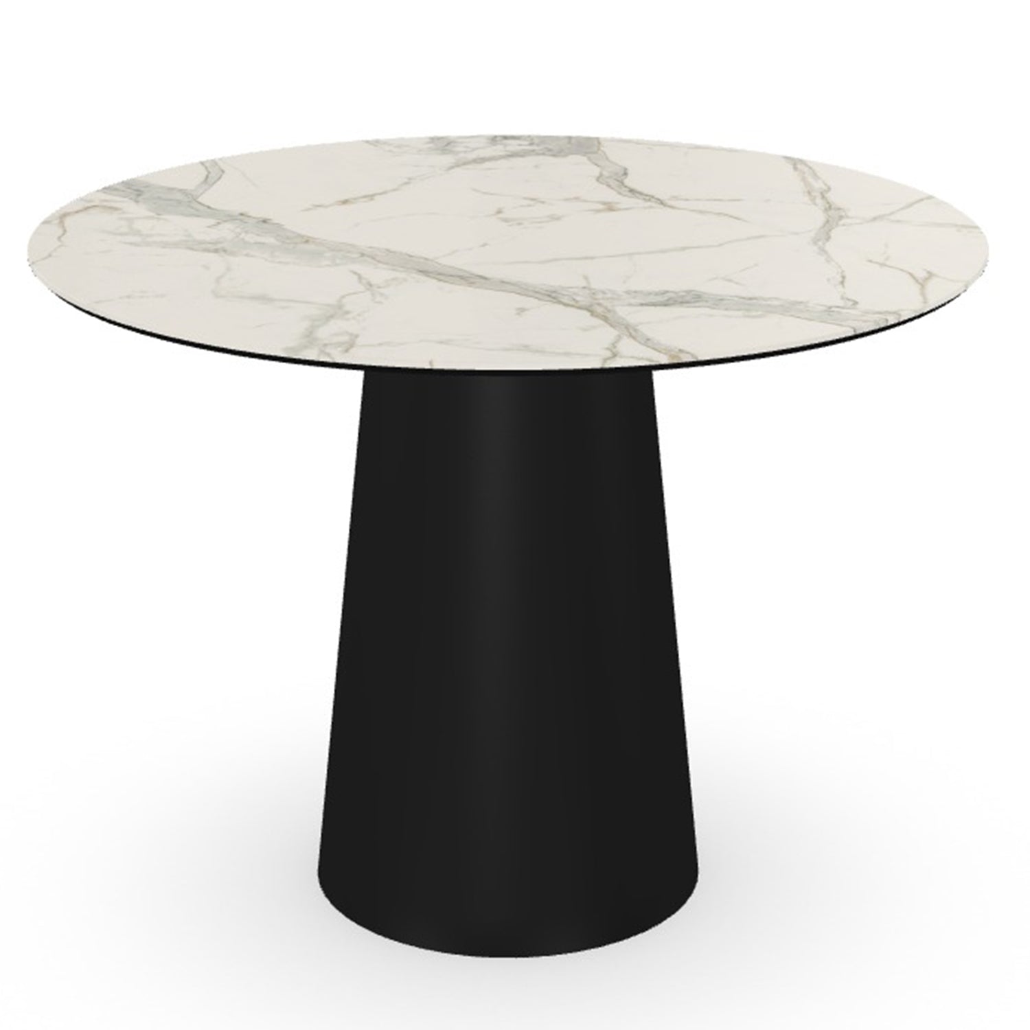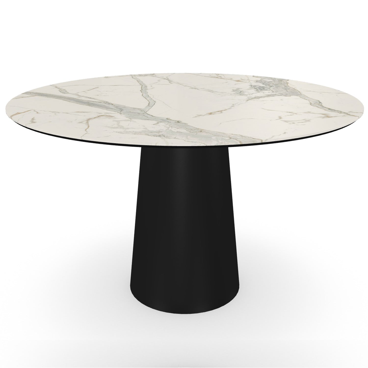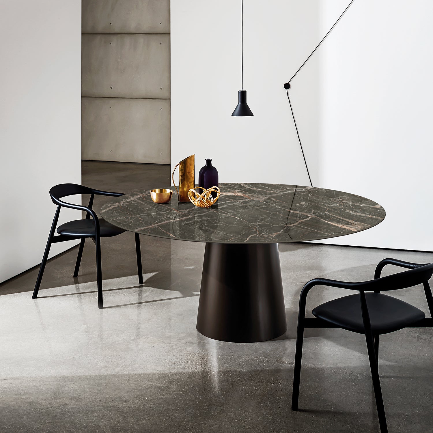 The Totem Dining Table by Sovet, combines bold geometry with expertly crafted materials. The circular table top is paired with a tapered pillar base, offering ample space to seat 4-6 people at the 100-120cm versions. From white calacatta marble-effect ceramic to polished stone, each material available in Sovet's extensive collection is produced with artisan skill derived from generations of traditional Italian glassmaking. This contemporary round dining table is characterised by the luxurious, tactile nature of the table top and the minimal shape of base creating a bold statement table for city living.