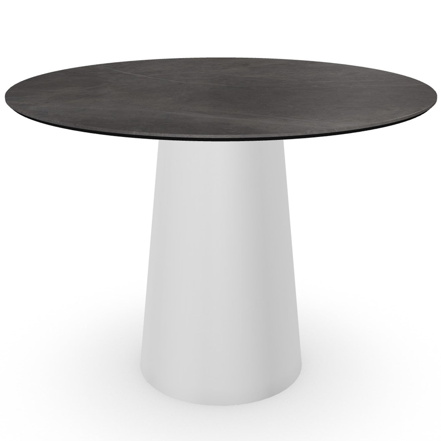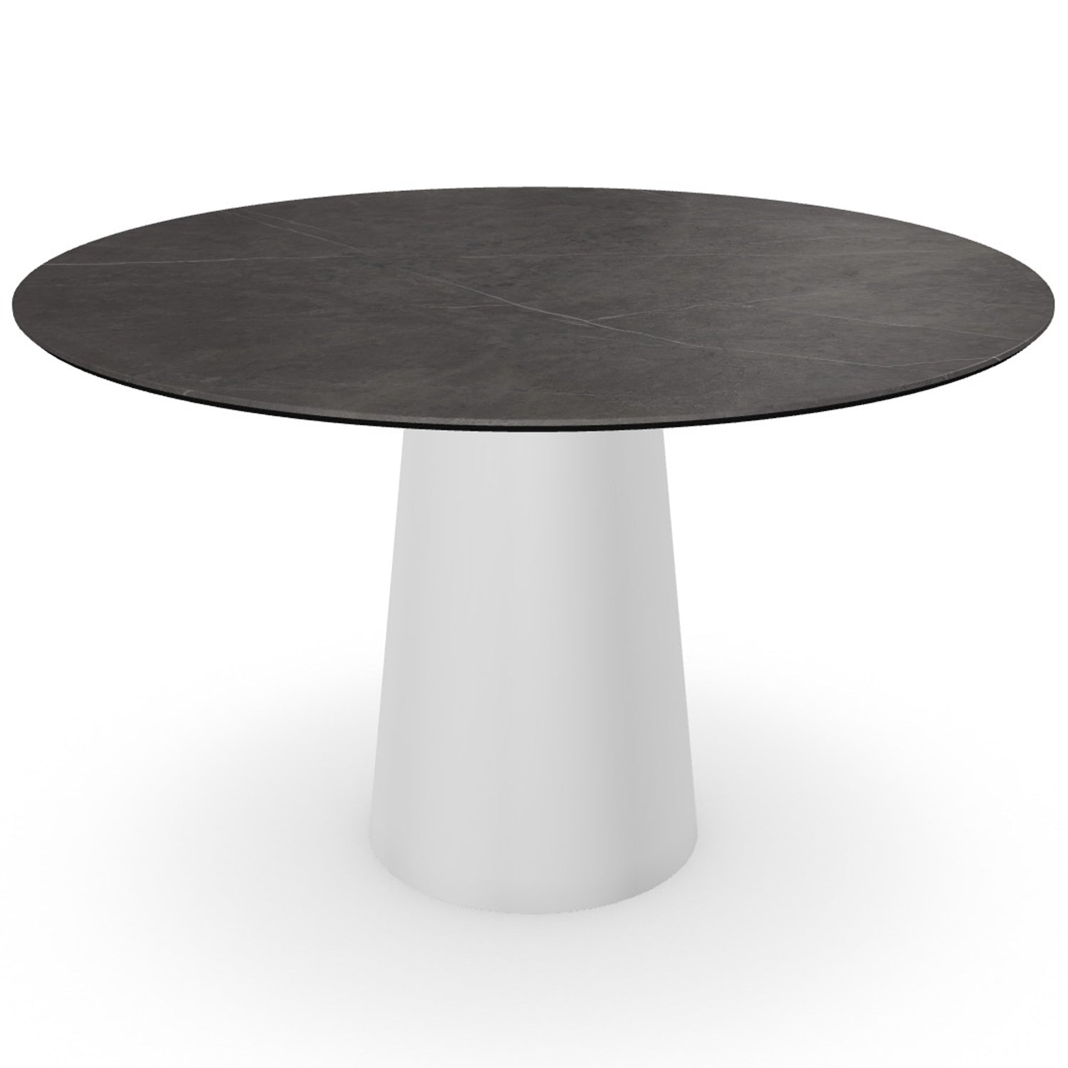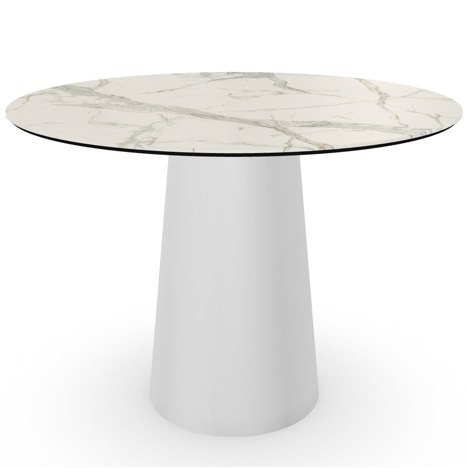 The Totem Dining Table by Sovet, combines bold geometry with expertly crafted materials. The circular table top is paired with a tapered pillar base, offering ample space to seat 4-6 people at the 100-120cm versions. From white calacatta marble-effect ceramic to polished stone, each material available in Sovet's extensive collection is produced with artisan skill derived from generations of traditional Italian glassmaking. This contemporary round dining table is characterised by the luxurious, tactile nature of the table top and the minimal shape of base creating a bold statement table for city living.