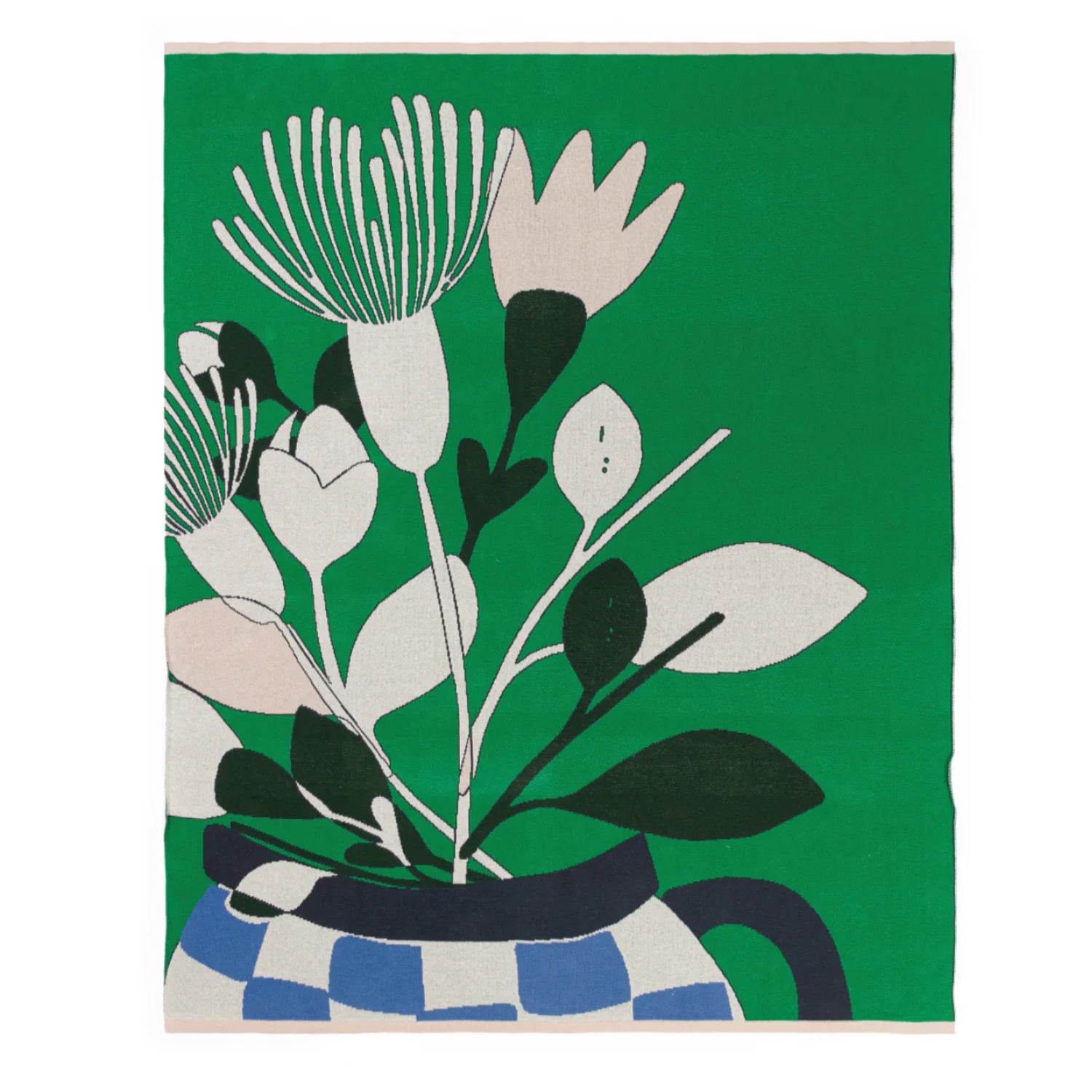 The Bud Throw, designed by Sophie Home, features a striking floral pattern in vibrant green, pale pink and cobalt blue. This botanical motif is depicted in a cubist style with a loosely-imagined vase of buds and stems. Crafted from a cotton knit, with a super-soft finish, this colourful throw is sure to add another dimension to your living space or bedroom. Machine washable.