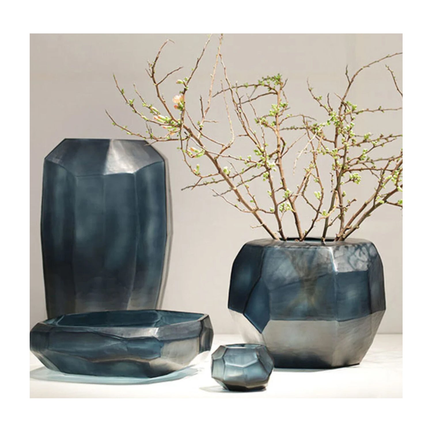 The Cubistic Bowl by Guaxs, exudes craftsmanship with its exquisite faceted form in mouth-blown glass. Featuring a an angular shape with a textured surface pattern in grey-green.