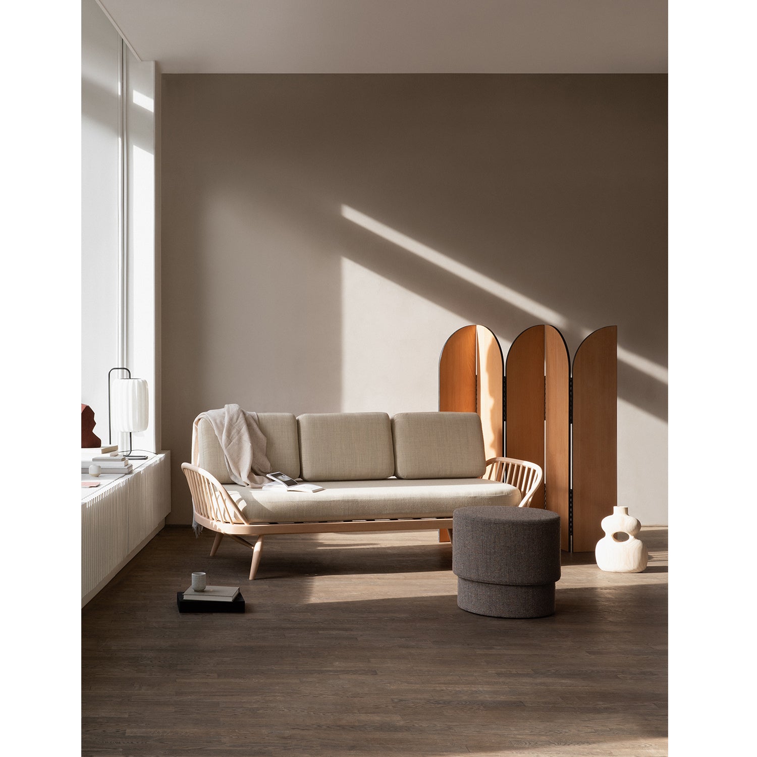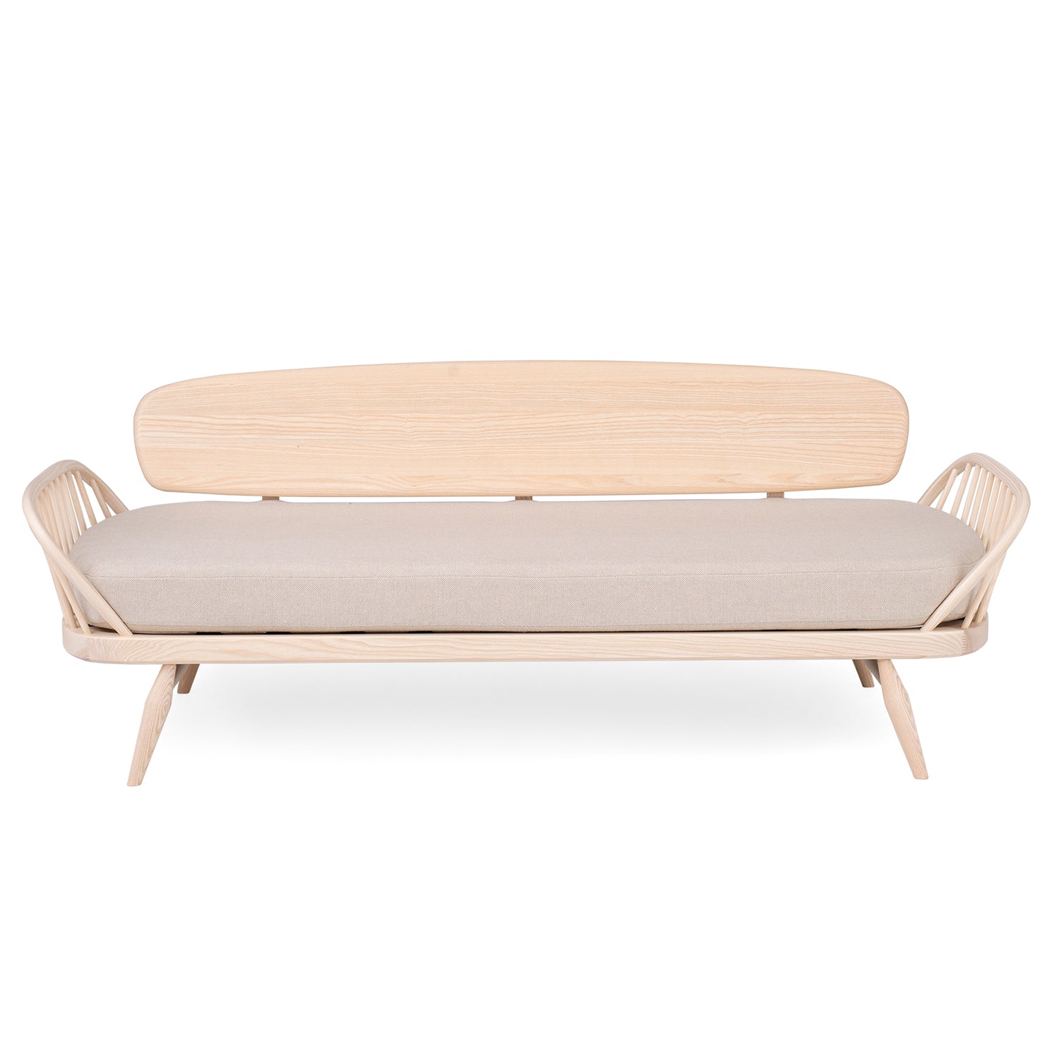 Designed in the 1950s by Ercol, the Studio Couch is a symbol of mid-century modern design. This three-seater sofa combines a steam bent ash frame, with arched arms rests comprised of tapered vertical spindles. The raised seat back is crafted from solid ash and the sofa is finished with outward-facing tapered legs, typical of the mid-century modern aesthetic. The multi-functional studio couch is designed to double-up as both a settee and a single bed, perfect for accommodating extra guests. This iconic design fits seamlessly into both modern and contemporary interiors.