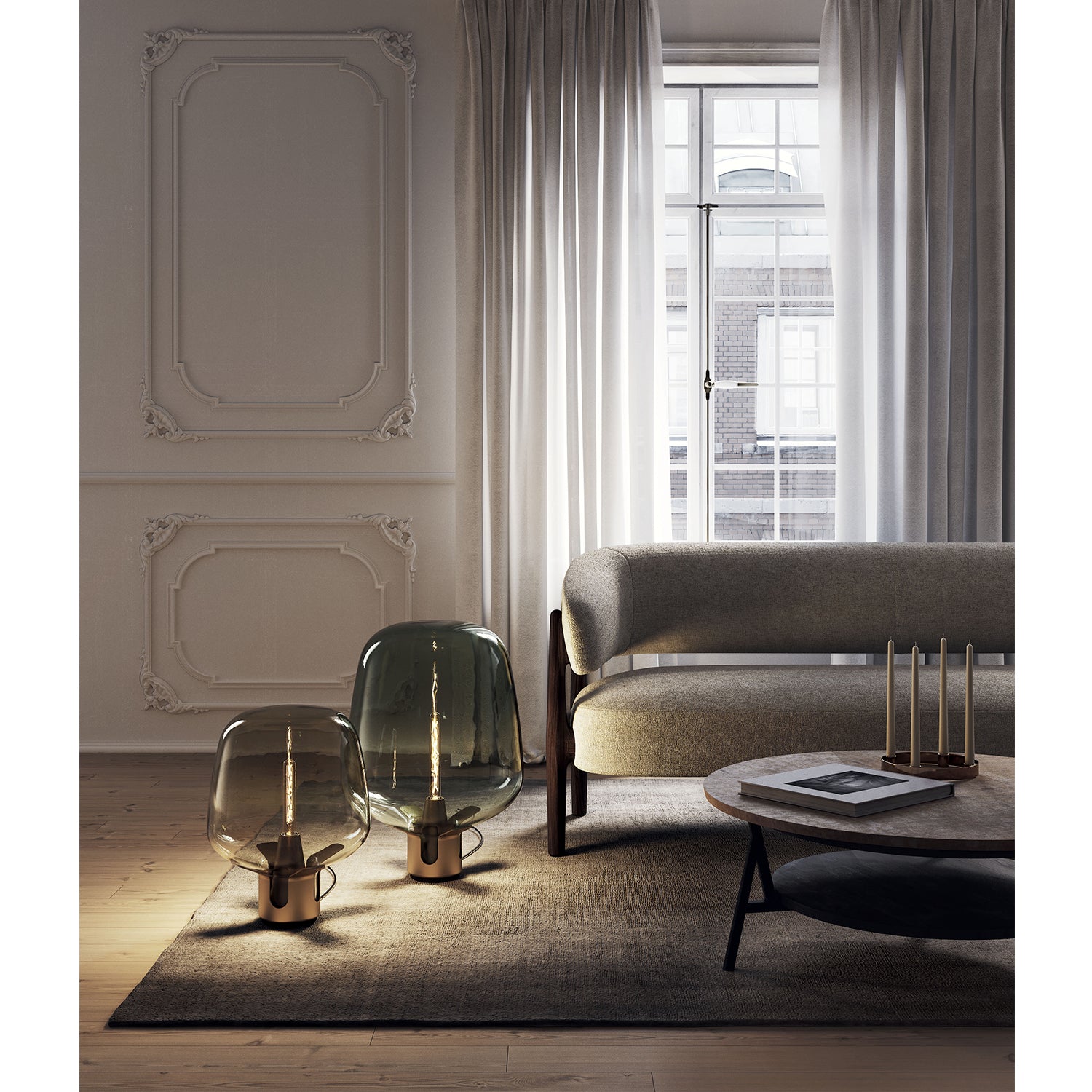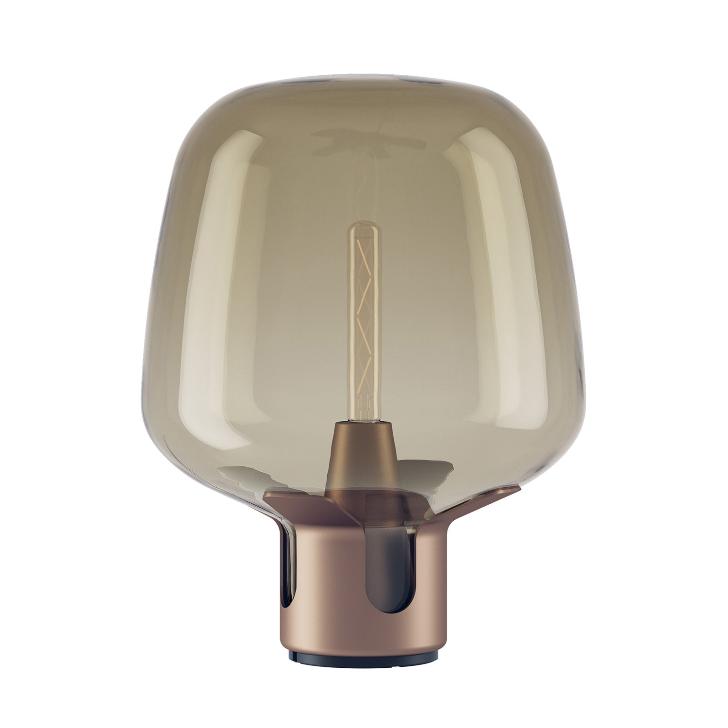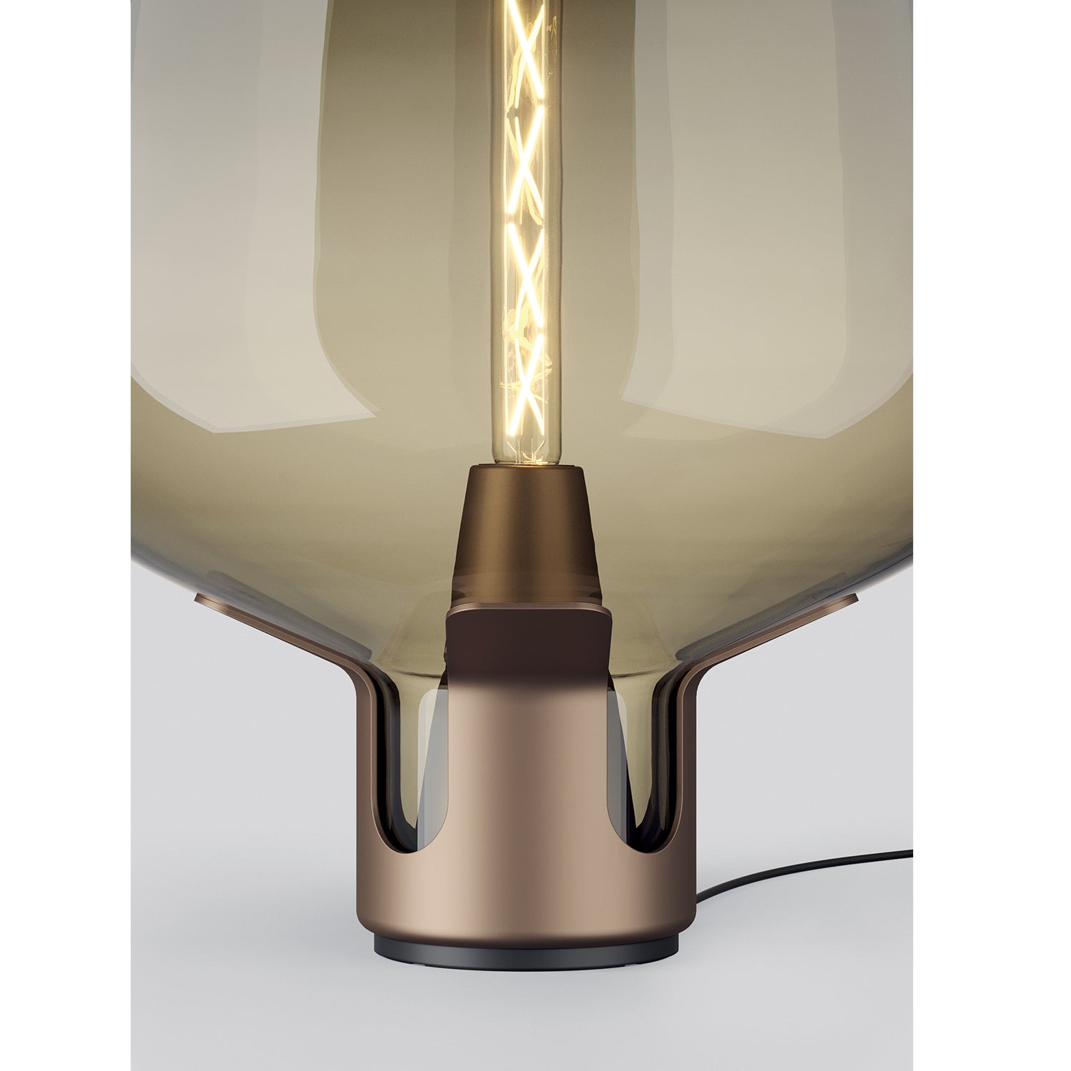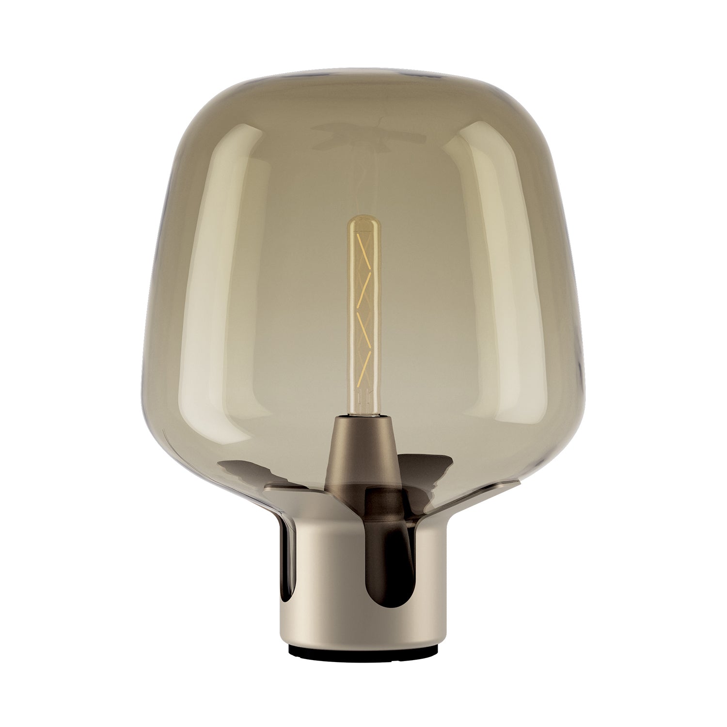 The Flar Lamp, designed by Patrick Norguet for Lodes, reinvents the concept of the traditional oil lamp with the latest lighting technology. With versatility at the core, Flar functions equally well as both a floor light and a table lamp. Inspired by storm lanterns containing glass pipes to protect the flame, Flar features a billowing glass shade with a smoked finish, surrounding an LED filament bulb, which magnifies the light source and diffuses a soft light, filtered by the tinted glass. The integrated dimmer switch enables full customisation to light ambience. Both the base and glass shade are available in a range of finishes.