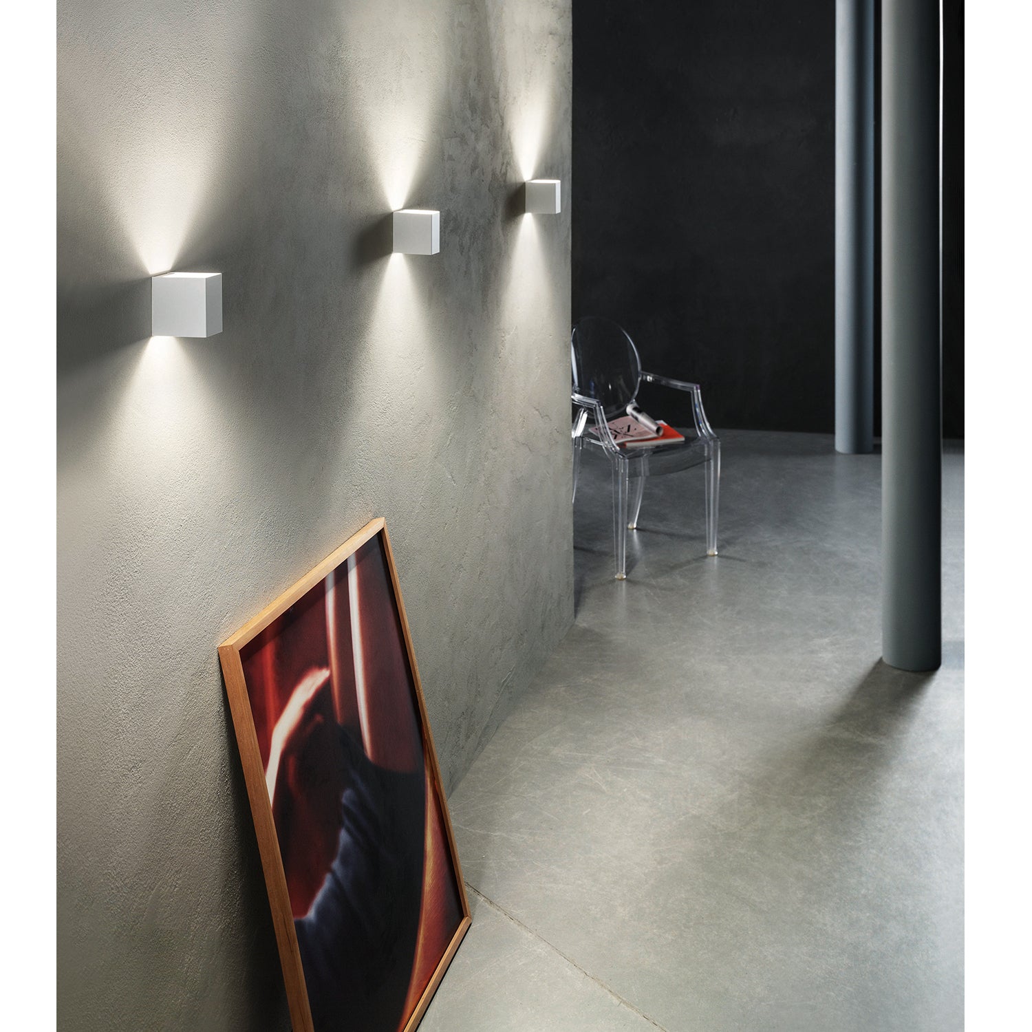 The Laser Wall Light, designed by Lodes is a compact and versatile light fixture in a streamlined cube form. Well suited to both domestic spaces or contract interiors, this modern wall light seamlessly illuminates the surrounding architecture. A geometric cube structure, in painted steel, conceals the LED light source, creating a play of illumination and shadow on the wall.
